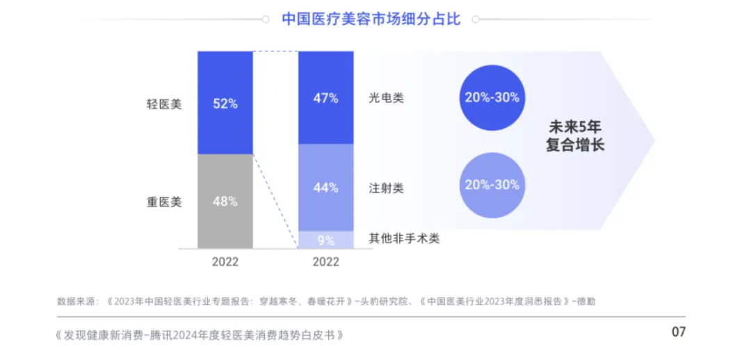 轻医美是指通过无创或微创等医学疗法实现肤质改善及延缓衰老的医疗美容服务。目前在医美市场中,轻医美发展更迅速,增长潜力更大。根据《腾讯2024年度轻医美消费趋势白皮书》,至2022年轻医美已贡献整体医美市场超过一半的市场规模,并超过重医美市场,成为医美市场的主流。其中光电类、注射类是主要的项目构成,且预计未来5年的仍能呈现20%-30%的高符合增长率。