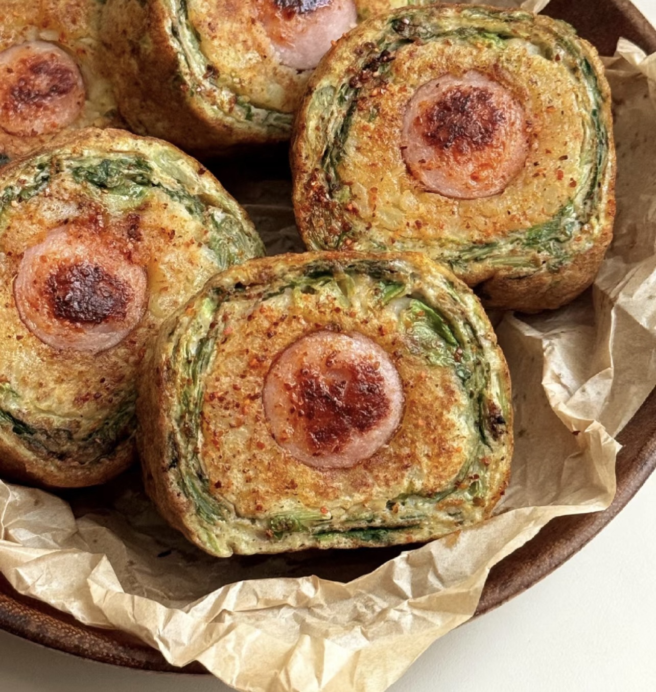 此时,锅里刷上一层薄油,小火加热。先倒入少量的生菜蛋液,蛋液在锅底迅速摊开,形成一层薄薄的蛋皮。待其微微凝固,将裹着土豆泥的脆肠小心翼翼地放在蛋皮上,轻轻卷起。接着,再次倒入生菜蛋液,蛋液凝固后再次卷起,就这样重复操作,如同在编织一个美味的梦境。