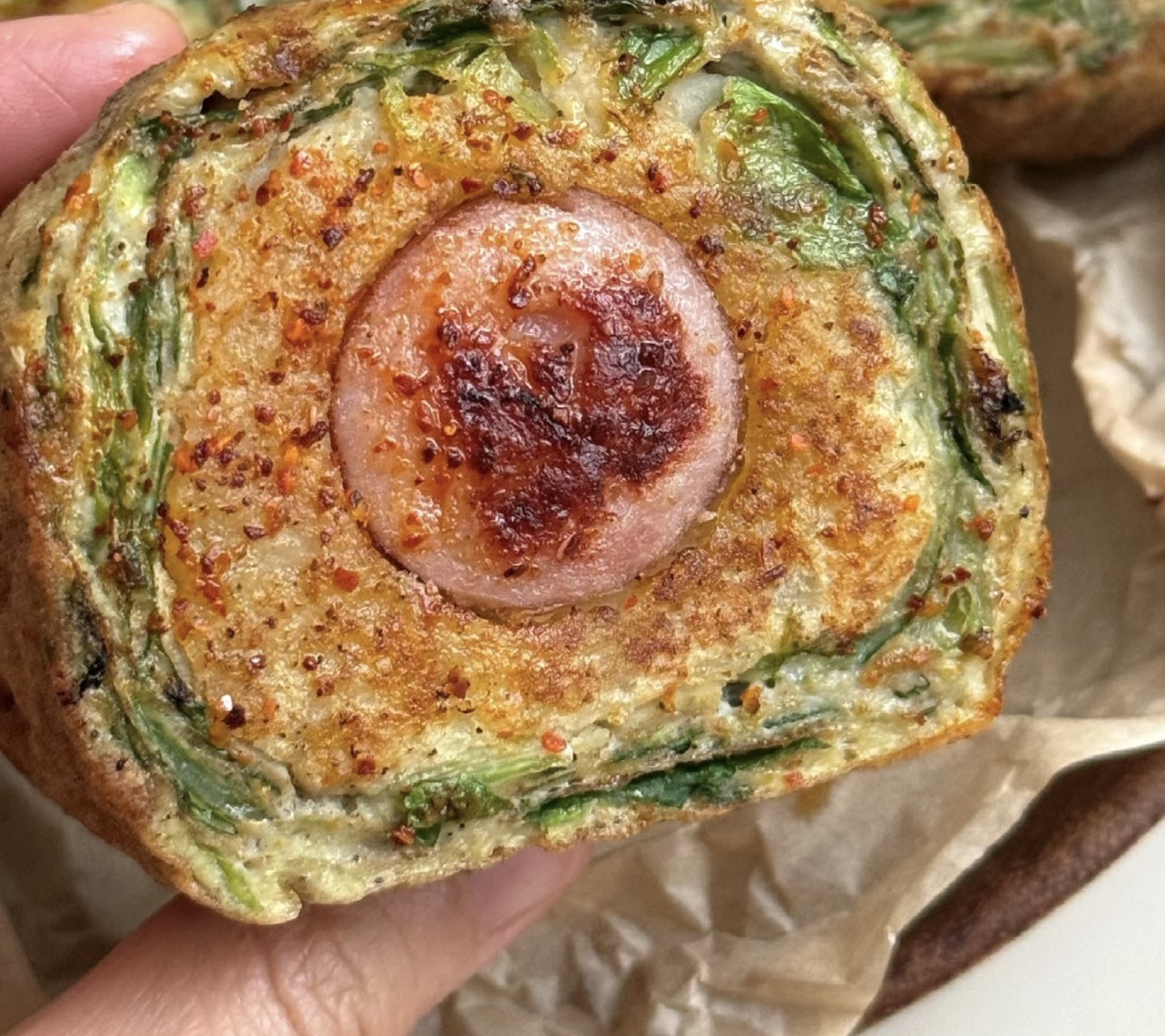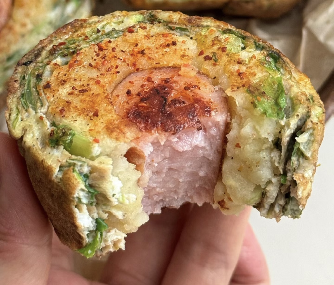 终于,期待已久的时刻来临。我迫不及待地拿起一块蛋卷放入口中,轻轻咬下。首先感受到的是辣椒酱带来的微微辣意,瞬间刺激了味蕾。接着,烟熏味的脆肠与细腻绵密的土豆泥相互交融,口感丰富多变。生菜的清爽和鸡蛋的嫩滑恰到好处地中和了油腻感,让每一口都充满了惊喜。