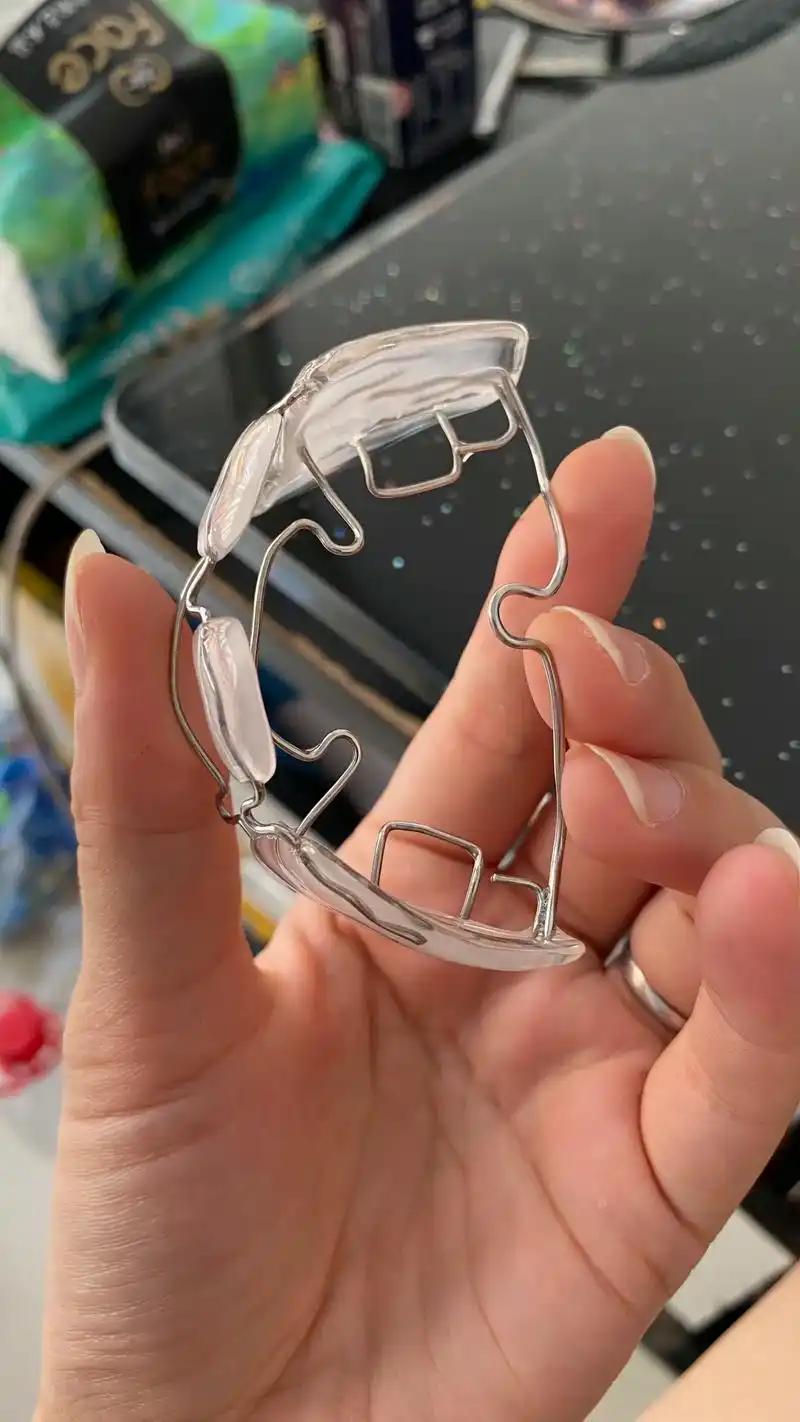 不过这女生之前做过牙齿矫正,现在一直戴着牙套保持器。