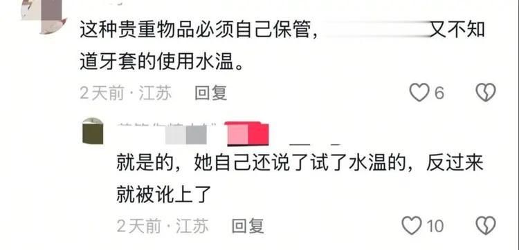 女生自称还没成年,是大学生,当初把牙套交给店员的时候,压根没提过水温要求,店员把盒子还回去的时候她也试了水温,当时没任何异议,结果吃完饭就说牙套被烫坏了。