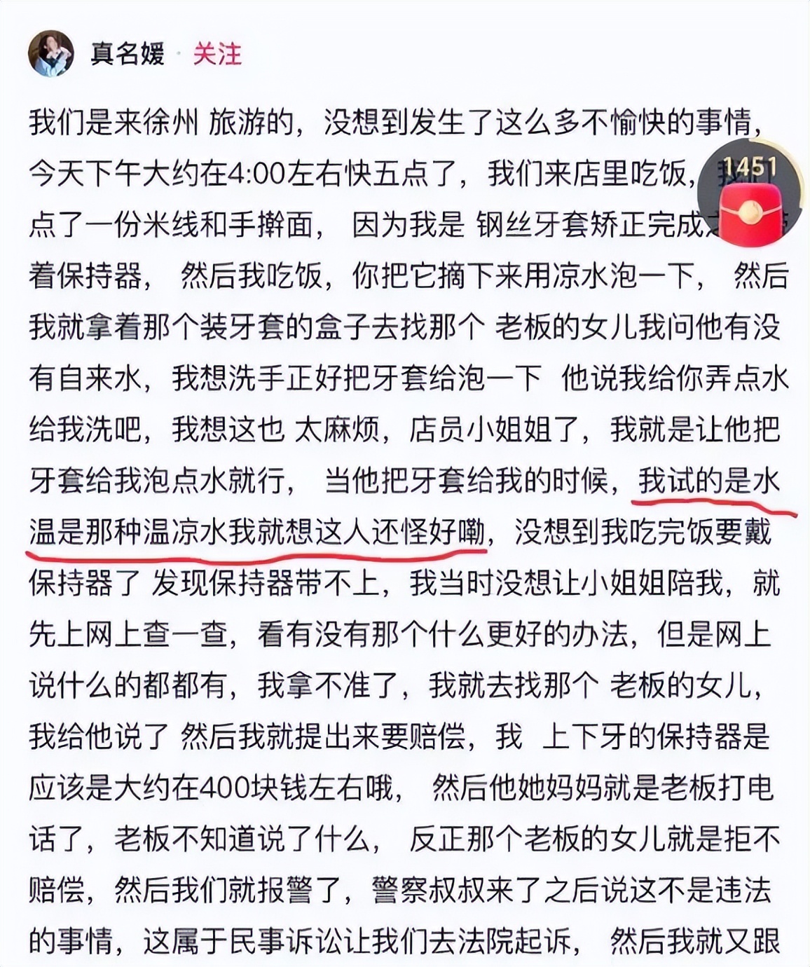 后来觉得牙套出问题了,她没先和店里好好商量,开口就要赔钱;被拒绝后,又是报警又是上网发视频。