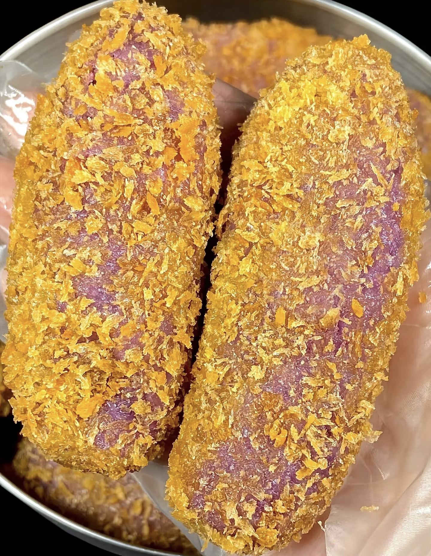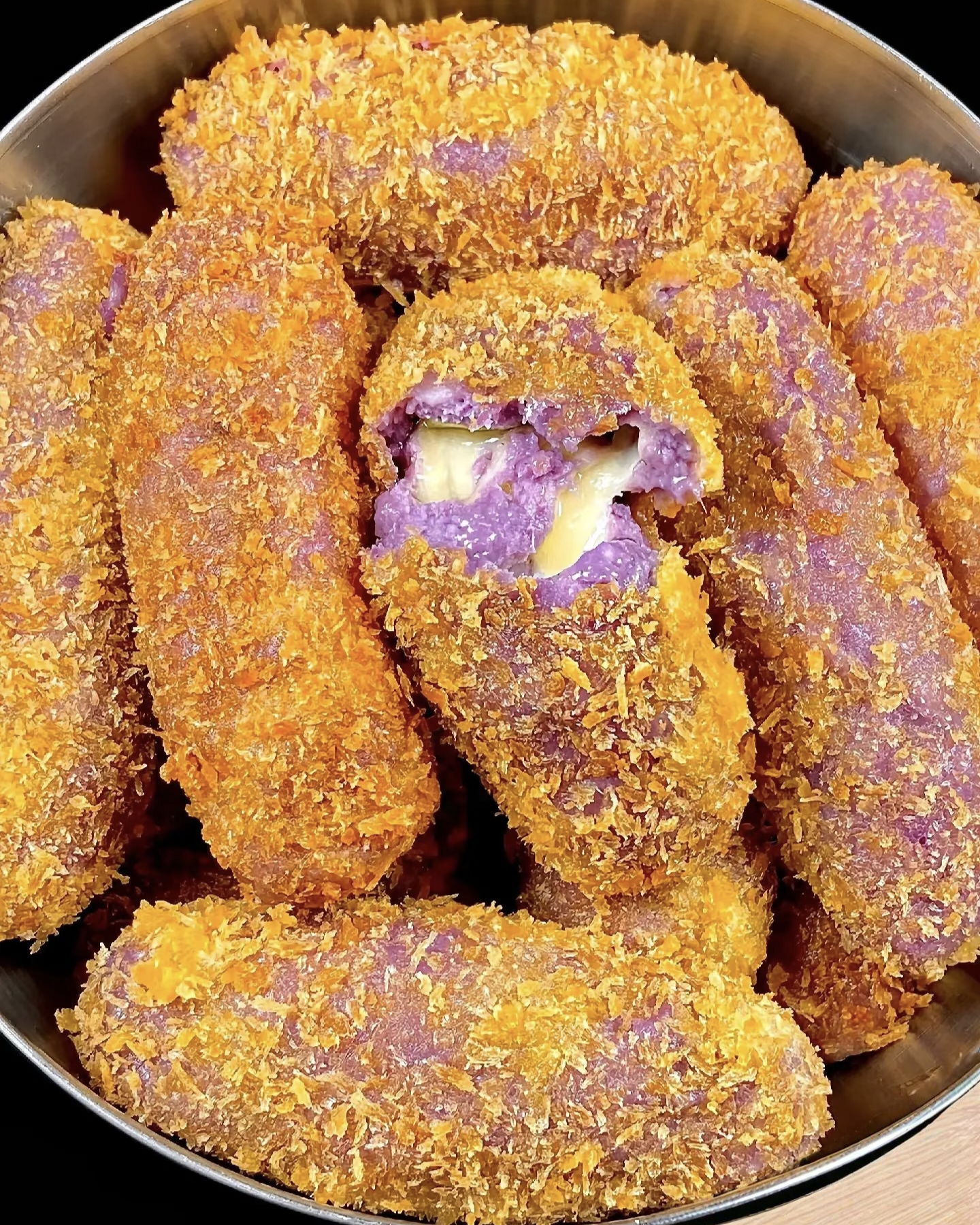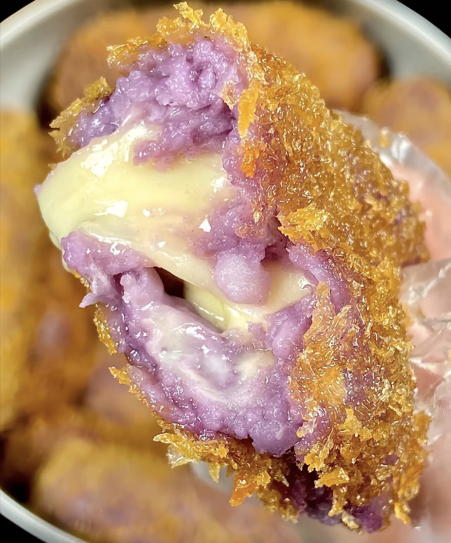 家人们!有没有过那种突然被美食灵感击中的时刻?我最近就脑袋一热,把软糯香甜的芝士芋泥紫薯,裹上面包糠,丢进油锅里炸一炸,嘿,你还别说,这味道直接原地封神!一口咬下去,先是面包糠“咔嚓”一声在嘴里炸开,接着是芋泥和紫薯的绵密香甜,最后还有芝士那浓郁醇厚的拉丝感,三种口感在舌尖上开派对,简直太上头啦!今天,我就把这道创意美食的简单做法毫无保留地分享给大家,让你们也能轻松在家享受这份美味暴击!