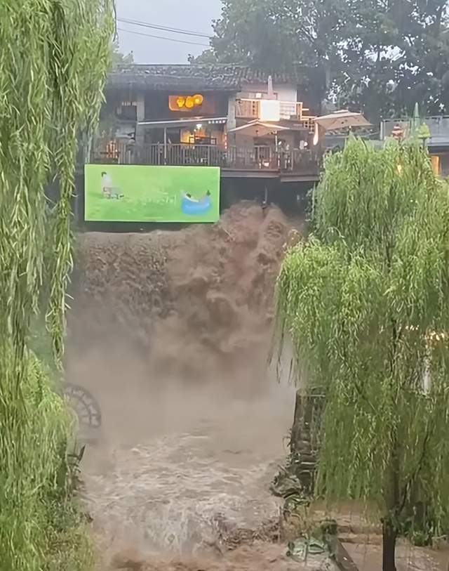 2025年7月8日下午,重庆市南岸区南滨路下浩里商业街因突降暴雨,形成一道气势磅礴的"迷你黄果树瀑布"。暴雨导致木桥处水流激增,浑浊的洪水倾泻而下,吸引游客驻足拍摄。尽管短时强降雨造成部分道路积水、树木倒伏,但商业街店铺因地势较高未受影响,正常营业。