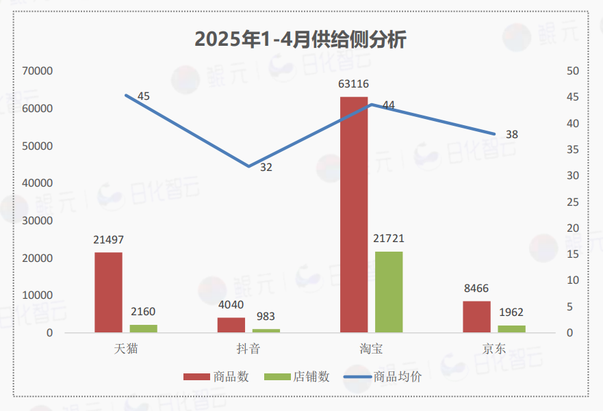 2025年1-4月抖音渠道商品数仅4040个,店铺数983家,商品均价32元,通过高流量转化+低客单爆款实现“以价换量”,验证内容电商已成最大增量入口。
