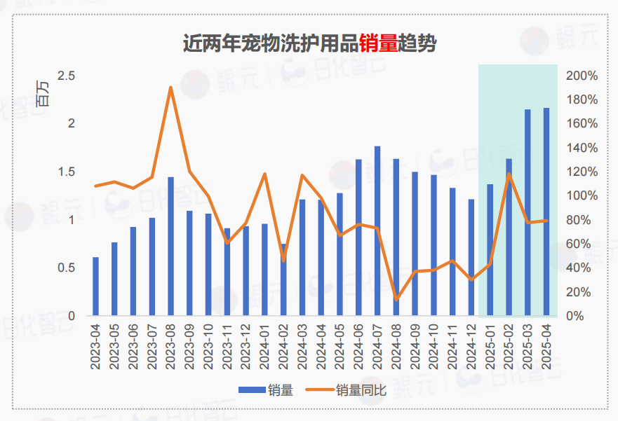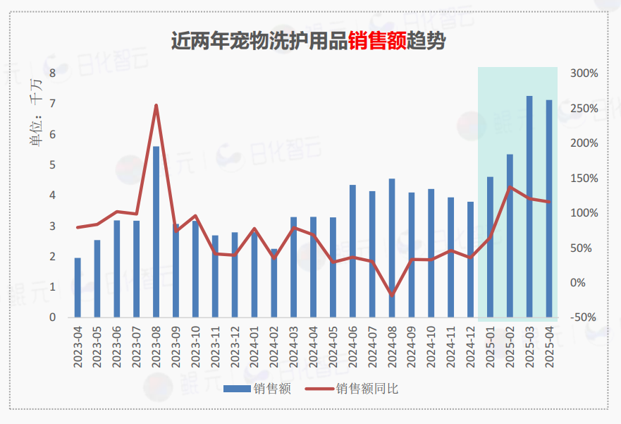 2023年4月至2025年4月,宠物洗护用品线上电商渠道销售额从1957万/月飙升至7129万/月(+264%),销量从61万件/月增至217万件/月(+255%),行业持续扩容。2023年8月、2024年3月和6月、2025年3月销售额环比分别增长77%、46%、32%、36%,对应夏季宠物清洁刚需和开年囤货潮。