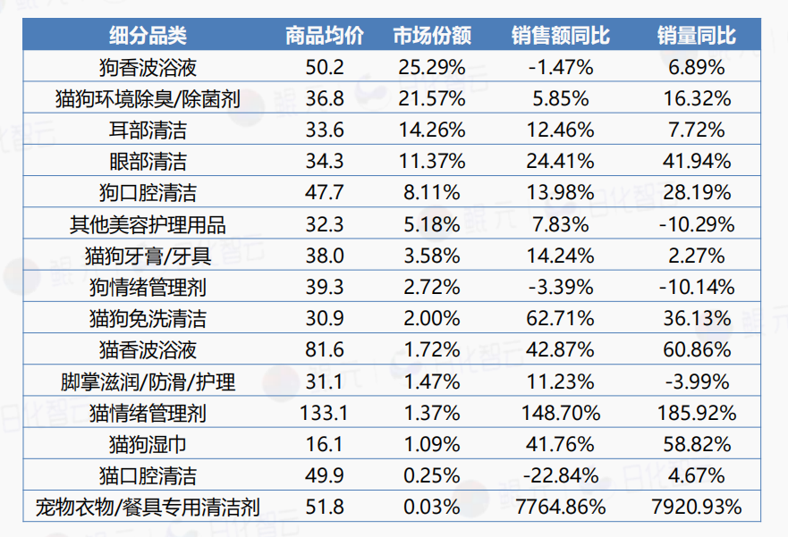 猫护理赛道全面崛起:猫香波浴液均价81.59元(狗香波的1.6倍),销售额同比增长42.87%,销量同比增长60.86%,高端化趋势显著;猫情绪管理剂同比暴增148.7%,销量激增185.9%,客单价133.1元验证“情感消费”潜力。