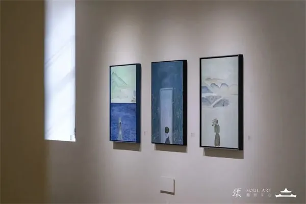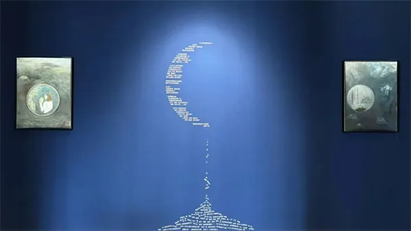 这是一场以女性肖像为核心,融合自然元素和超现实主义梦境的画展。翟永明的画作自成一派。近看她的作品,女性的头部被植物缠绕,形成了一种独特的视觉语言。枝叶的漫生长不仅是视觉上的延伸,更是对女性内心世界的隐喻和构筑。在展览中精心粉刷出的一个蓝房间里,翟永明以《月球的背面》为引,将图像诗与绘画组成一场视觉与文字的互文。她将诗歌的韵律与绘画的笔触相融合,绘制出一幅对太空的诗意想像。在翟永明的艺术世界里,文字与绘画并非孤立存在,而是形成了一种“互文的关系”,它们相互渗透、缠绕、融合,创造出一种独特又诗意的艺术语言。