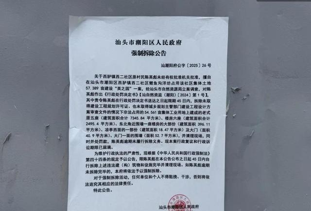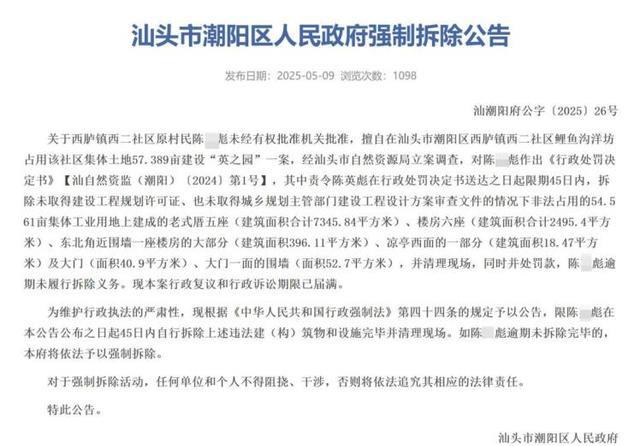 但当事人陈英彪拒不配合没收,后面相关部门开始走一系列法律程序,2024年,政府作出行政处罚决定,责令陈家自行拆除。