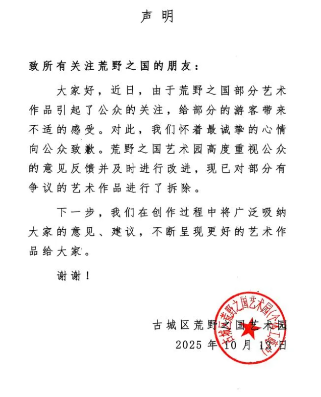 第二阶段:紧急道歉拆除随着舆情发酵,#丽江景区惊悚雕塑#话题阅读量破2.3亿,美团评分从4.8暴跌至3.2,退票量激增5倍。10月13日深夜,景区发布致歉声明,承认“未考虑60%家庭游客的接受度”,24小时内拆除争议雕塑,并承诺优化创作流程。