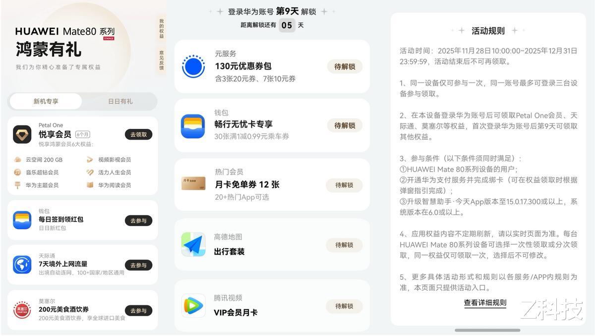 “鸿蒙有礼”权益大礼包不仅可以每天签到领随机现金红包,还赠送的6个月的Petal One悦享套餐,可以一次解锁华为视频、华为音乐和华为云空间等6大鸿蒙应用会员权益,更香的是,登录华为账号第9天一次送12张热门应用的月卡免单券、腾讯视频VIP会员月卡和各种礼包。没有一个追剧党能拒绝那么多视频App的会员,这下在腾讯视频、芒果TV、优酷还有爱奇艺囤的精彩内容可以看到爽了,还摆脱等广告的困扰。