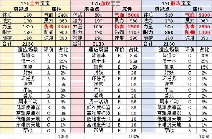 因为受制于进阶情况、资质、宝宝装备等等因素,这个表仅供参考,就是个大体数据。