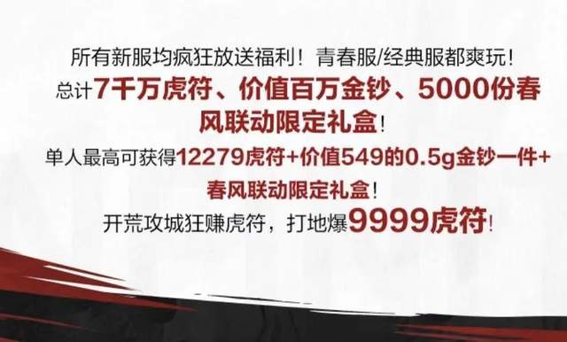 现在正值开荒节,1亿补贴砸得玩家们眼花缭乱!光是登录新服并达成对应条件就能瓜分7000万虎符+百万金钞,首占5级地必爆9999虎符红包,攻城榜TOP3的大神还能喜提0.5g足金金钞——这可是真金白银往你家寄啊!网易这波操作怕不是要亏到破产!