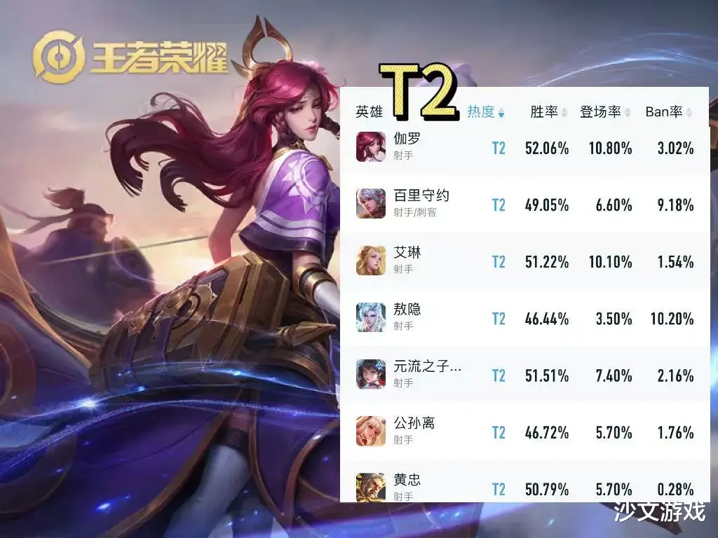 排在发育路热度榜T2的英雄有伽罗、百里守约、艾琳、敖隐、元流之子(射手)、公孙离、黄忠。