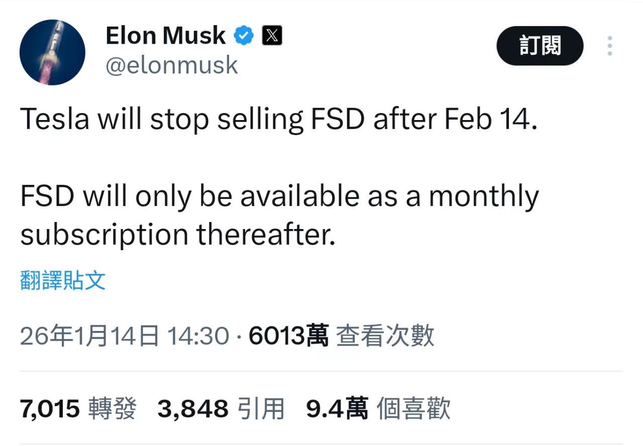 就在前不久马斯克宣布,2026年2月14日起,FSD将不再提供一次性买断服务,转而变为按月订阅。 这意味着,曾经6万4才能愉快玩耍的FSD,可能只需大几百即可体验。