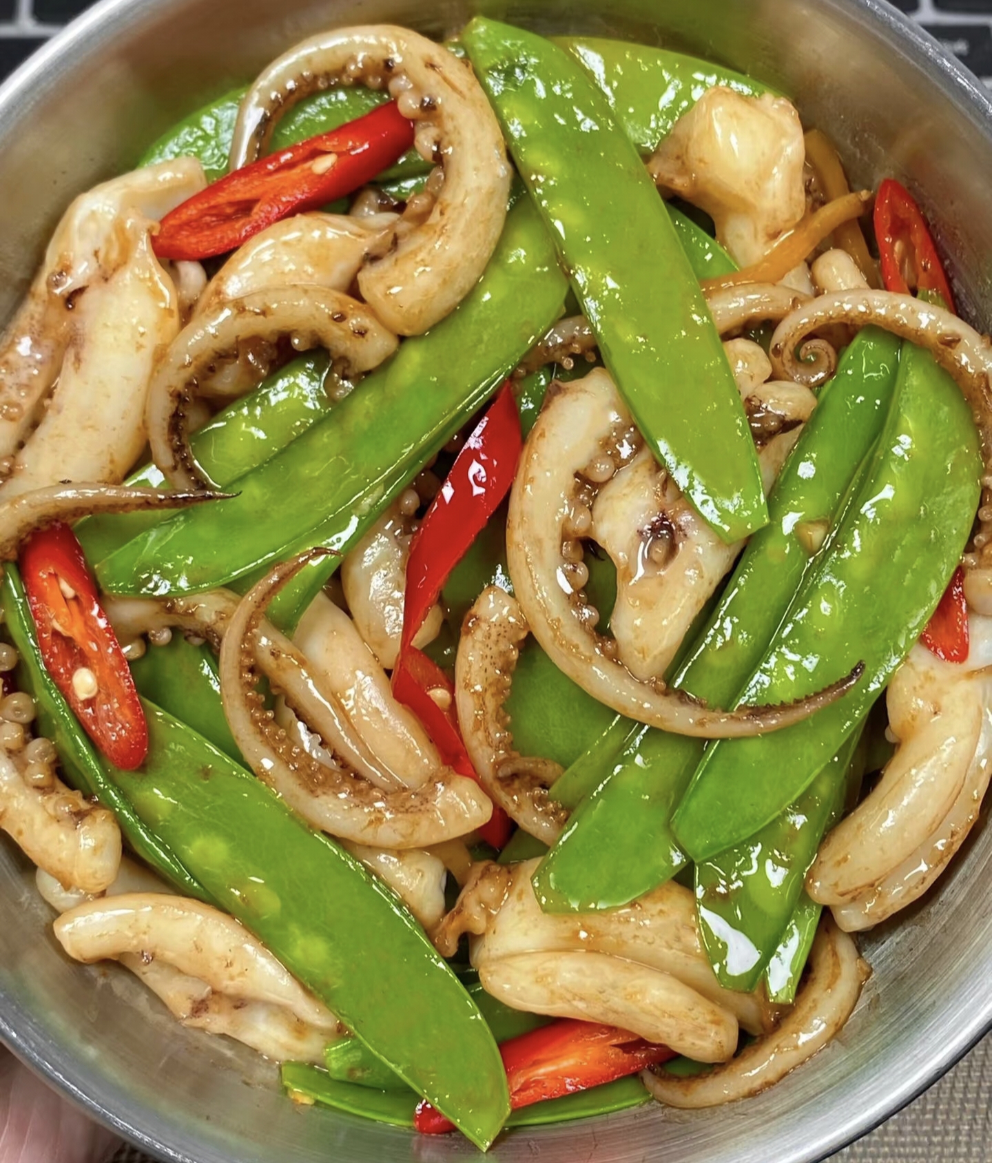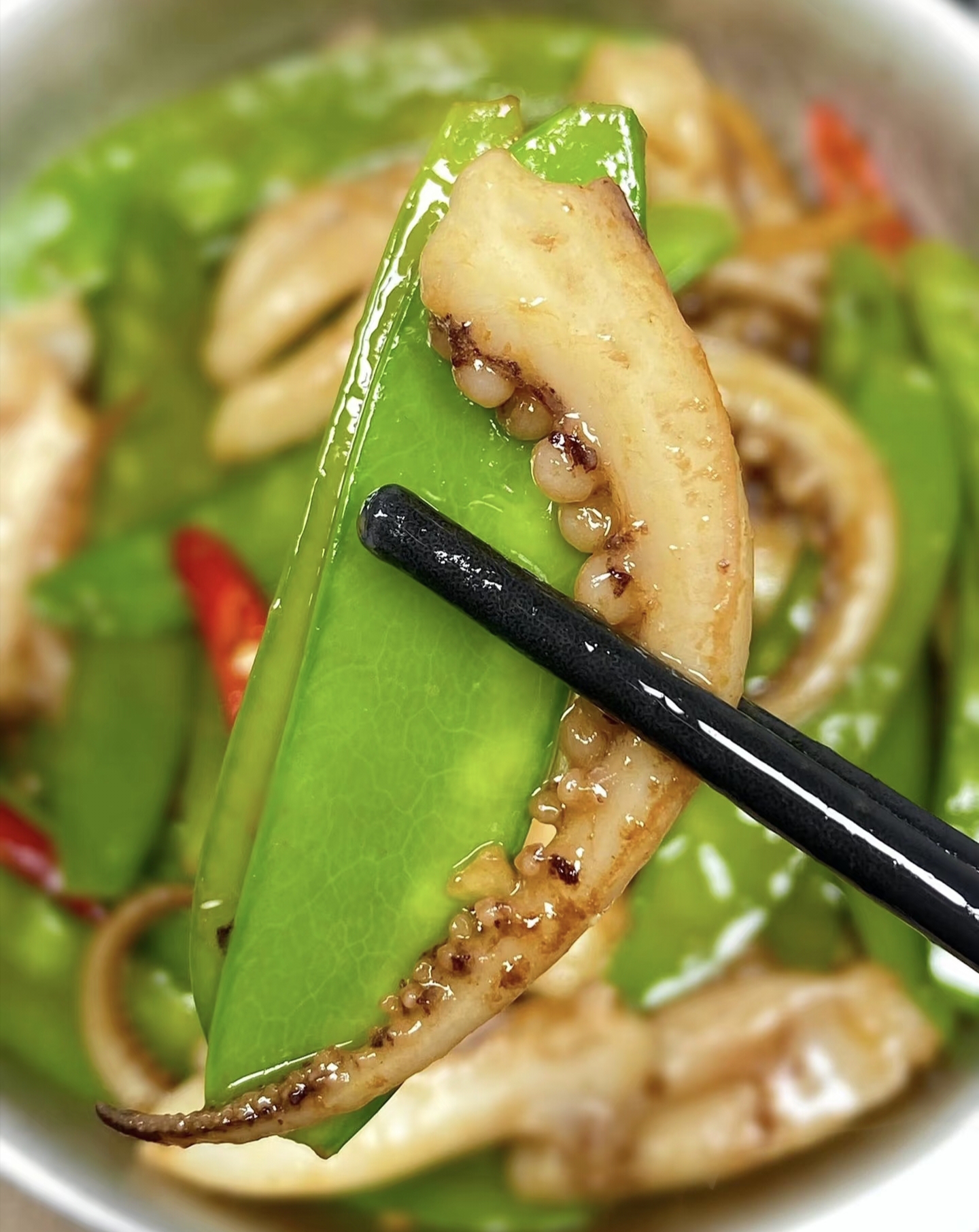 不用洗锅,直接补半勺油,下蒜末爆香。蒜香飘出时倒入荷兰豆,保持大火翻炒。这时候会听到"噼里啪啦"的欢快声响,像在演奏厨房交响曲。看到豆荚颜色从草绿变成翡翠绿,立刻倒入调好的酱汁,翻炒三下就赶紧把鱿鱼倒回去。最后15秒是决定成败的时刻:所有食材在锅里翻滚跳跃,酱汁均匀包裹每片食材,关火!
