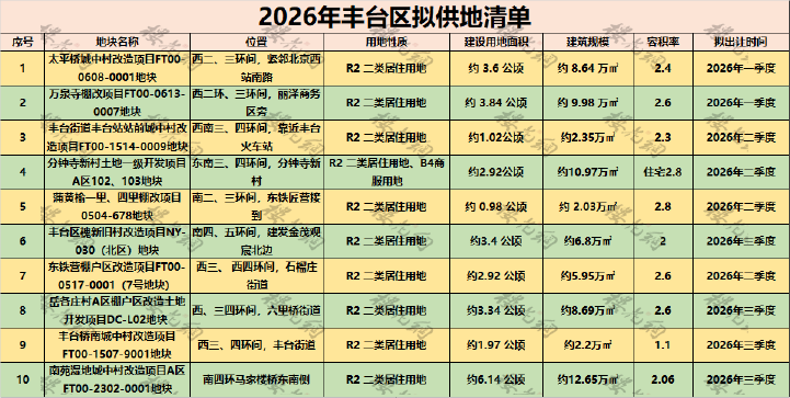 十分巧合的是,就在朝阳区召开土地推介会不久,丰台区2026年拟供地清单也出来了。