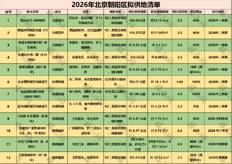 2026年朝阳区拟推出12块宅地,共计规划建面共计137万平米——纯住宅约128万平米,每个季度供应三宗。