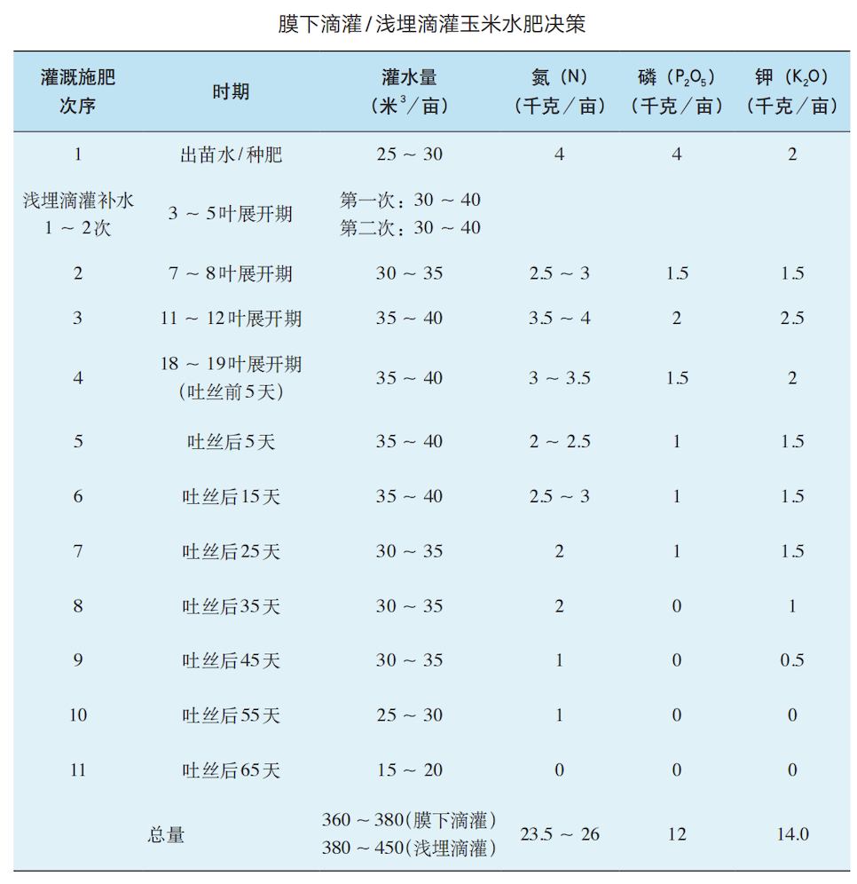 玉米生长季追肥通过施肥装置随水滴施滴灌专用肥或其他速效肥。头水后,玉米迅速生长,抗旱能力下降,应及时灌第二水,以后每次灌水时间和间隔应根据天气情况、植株形态和土壤含水量确定,间隔时间为8~12天。其中,膜下滴灌玉米拔节期和大喇叭口期滴水施肥2~3次,抽雄至灌浆成熟期滴水施肥7~9次。在此基础上,浅埋滴灌玉米应根据苗情适量补水1~2次(3~5叶期)。推荐水、肥施用时间及用量见下表。