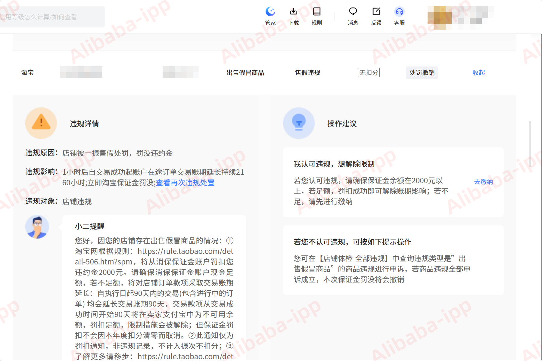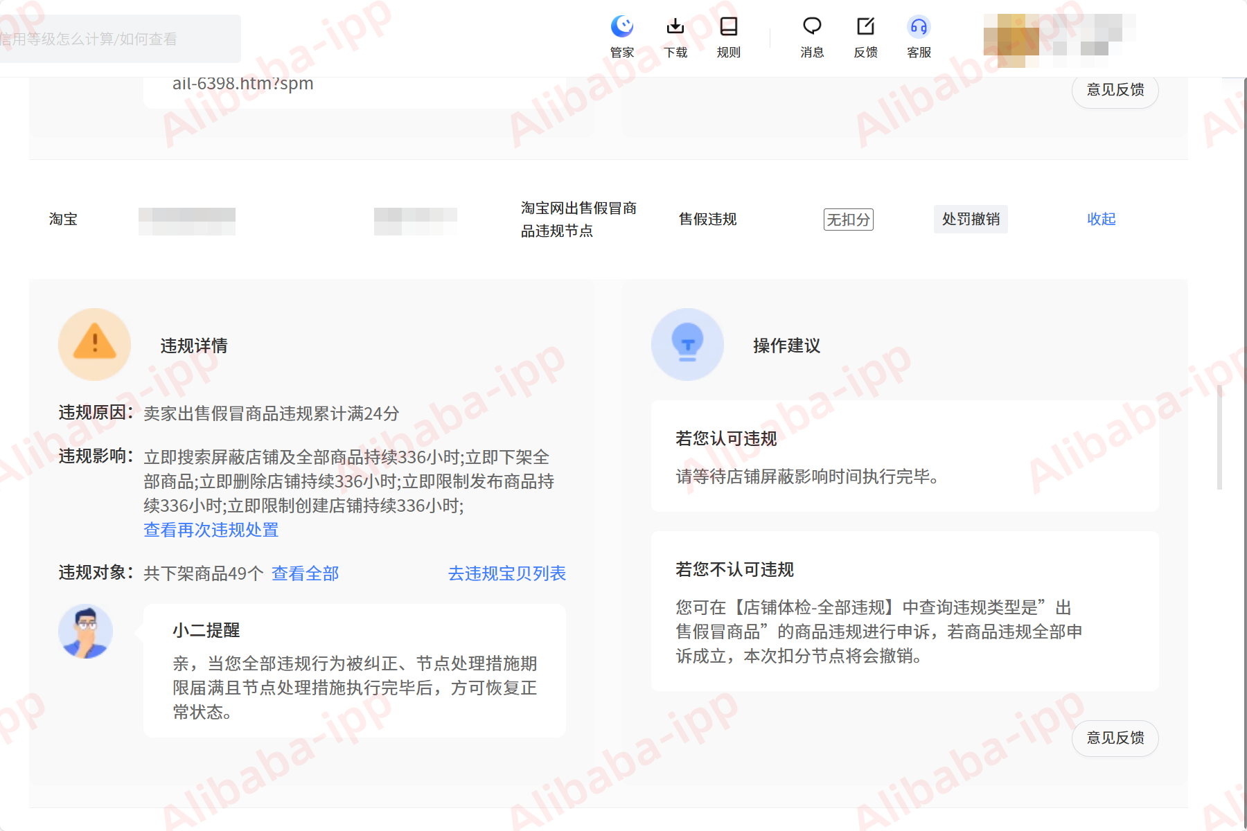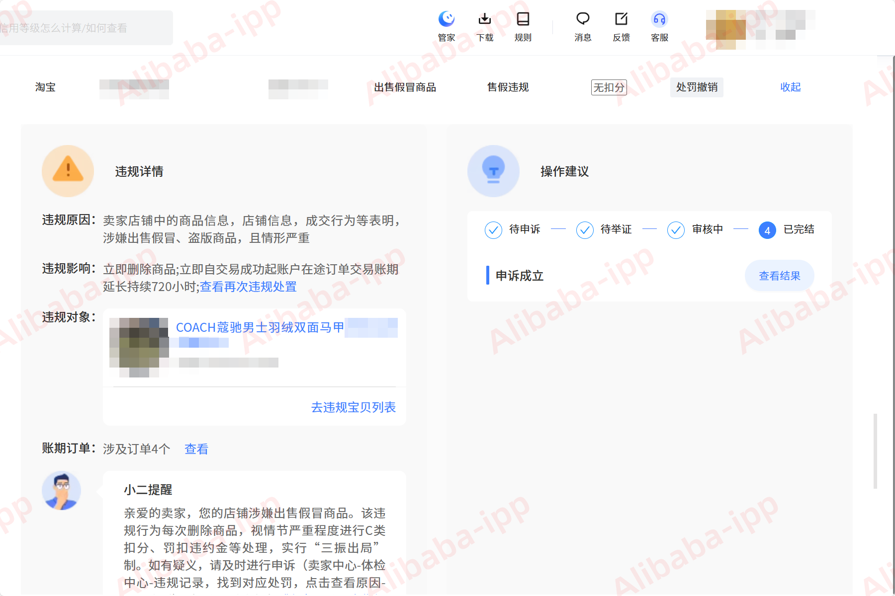 违规原因:商品信息、店铺信息、成交行为等表明,涉嫌发布假冒、盗版商品