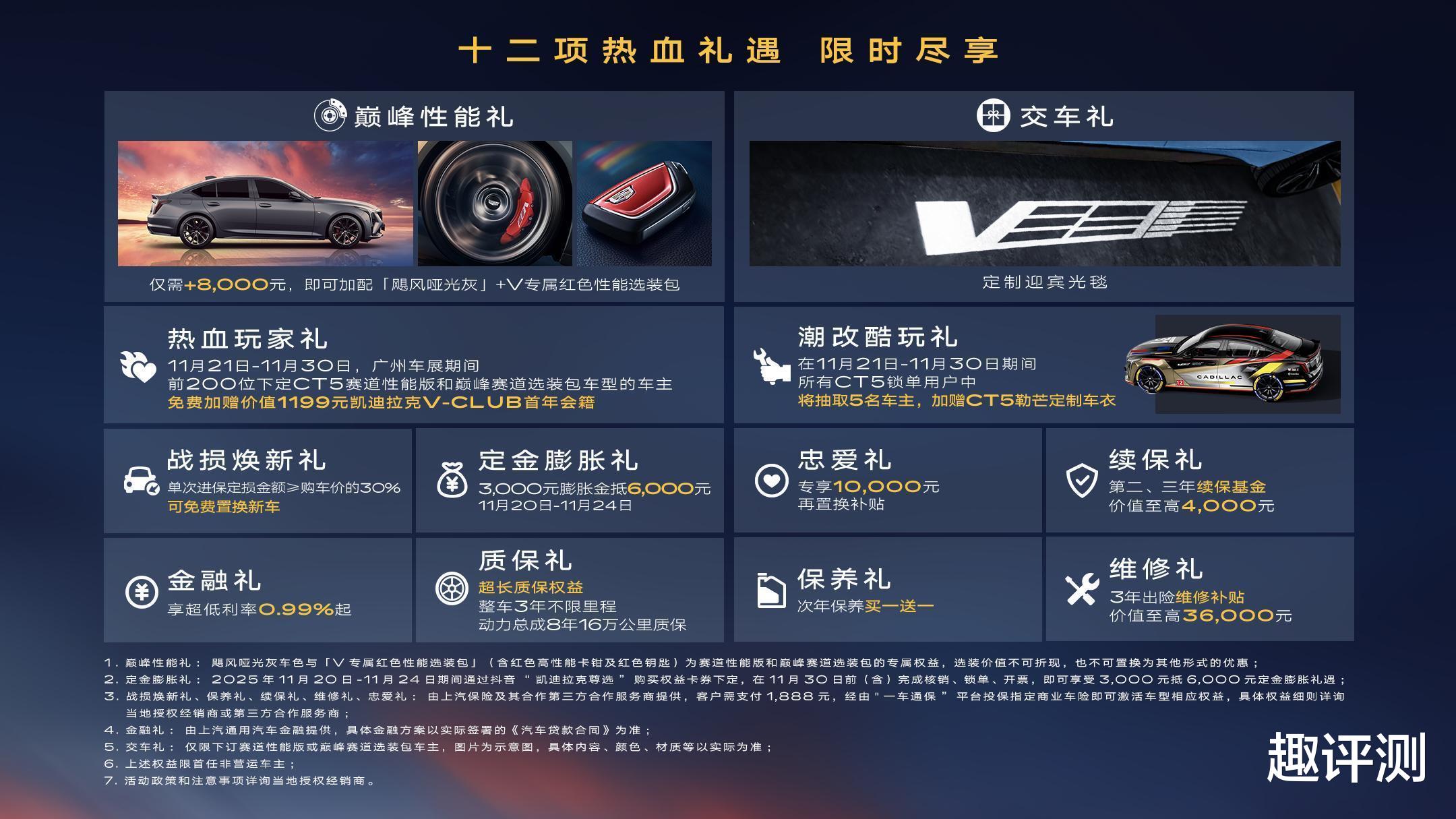 热血玩家礼在11月21日-11月30日广州车展期间,为前200位下定CT5赛道性能版和巅峰赛道选装包车型的车主,免费赠送价值1199元的凯迪拉克V-CLUB首年会籍;