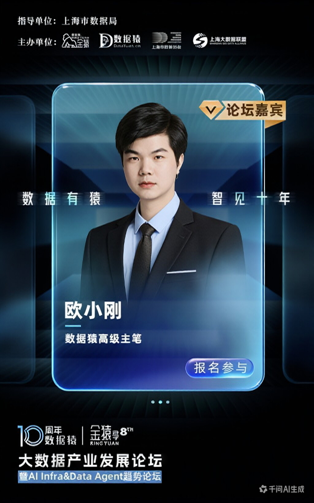 数据猿高级主笔 欧小刚,已确认出席由上海市数据局作为指导单位,金猿组委会×数据猿×上海市数商协会×上海大数据联盟联合主办的“第八届金猿大数据产业发展论坛 —— 暨AI Infra & Data Agent趋势论坛”。