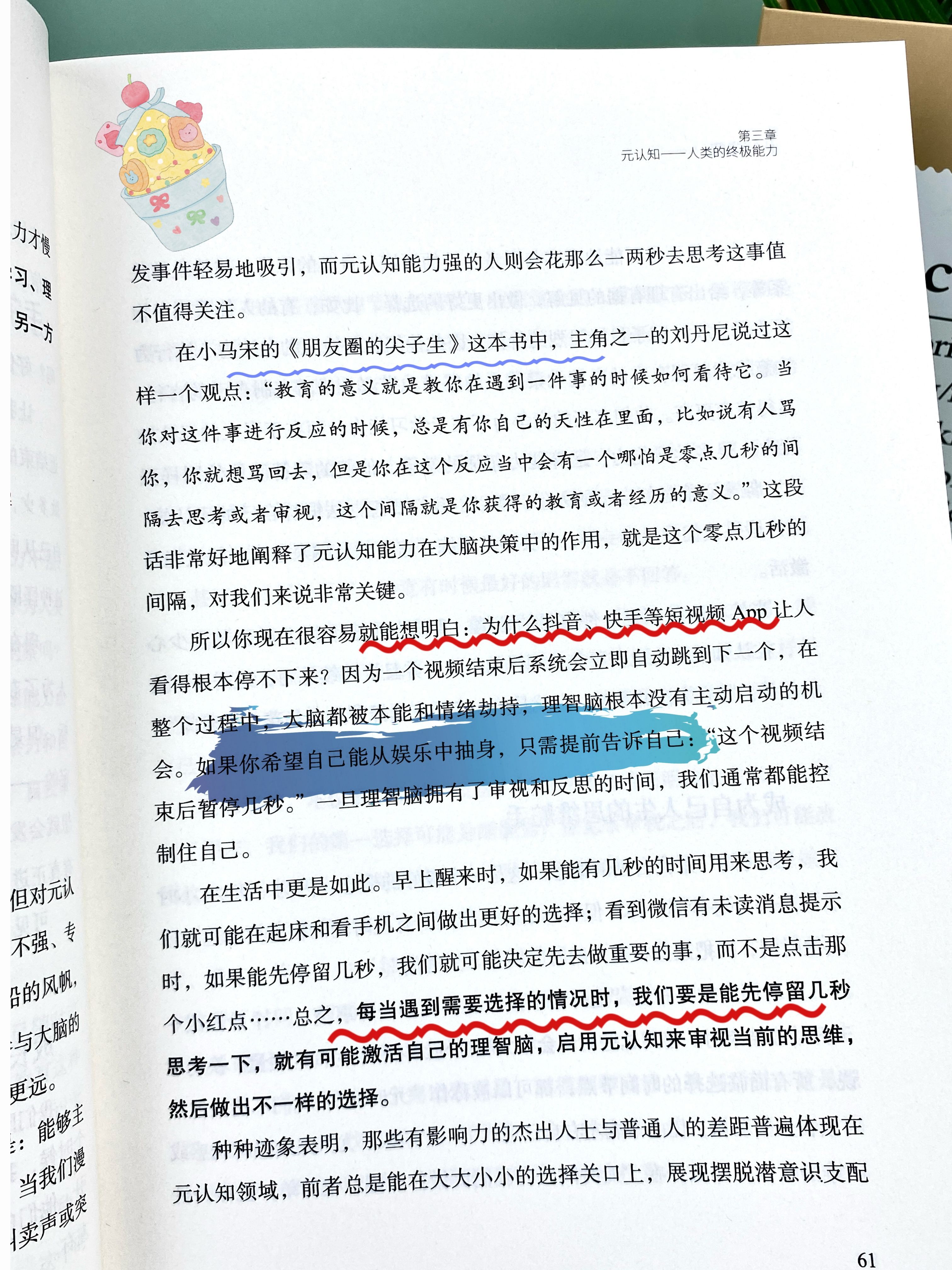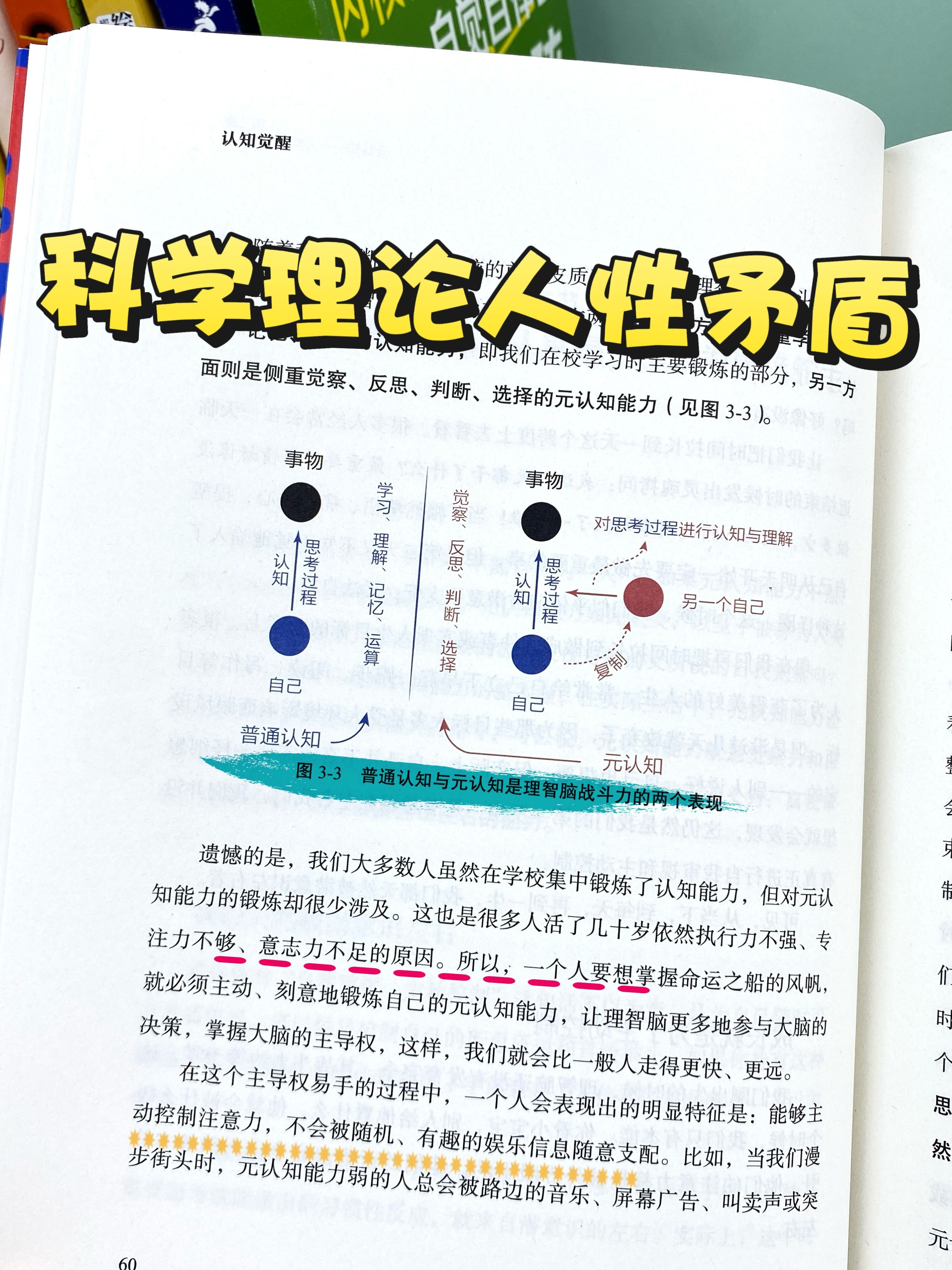 随着我们不断长大,大脑的前额皮质开始发育,理智脑的战斗力才慢增强。不过理智脑的战斗力其实表现在两方面:一方面是侧重学习、理解、记忆、运算的认知能力,即我们在校学习时主要锻炼的部分,另一方面则是侧重觉察、反思、判断、选择的元认知能力。"