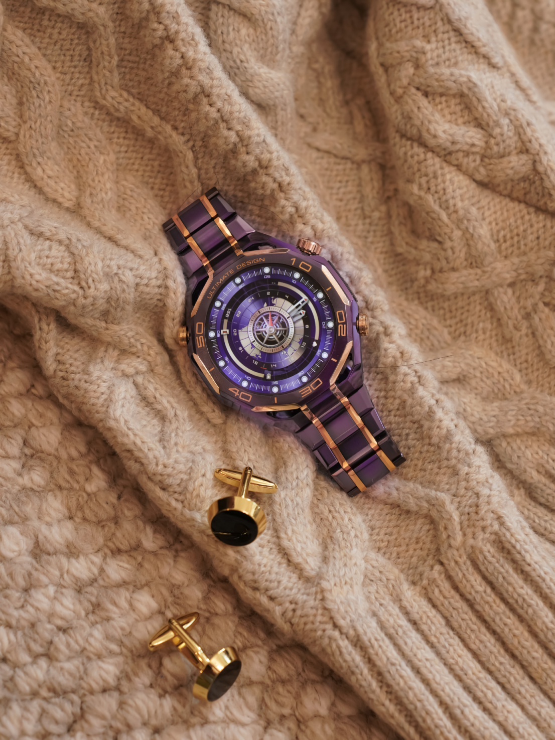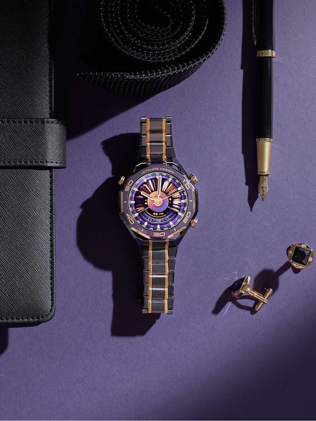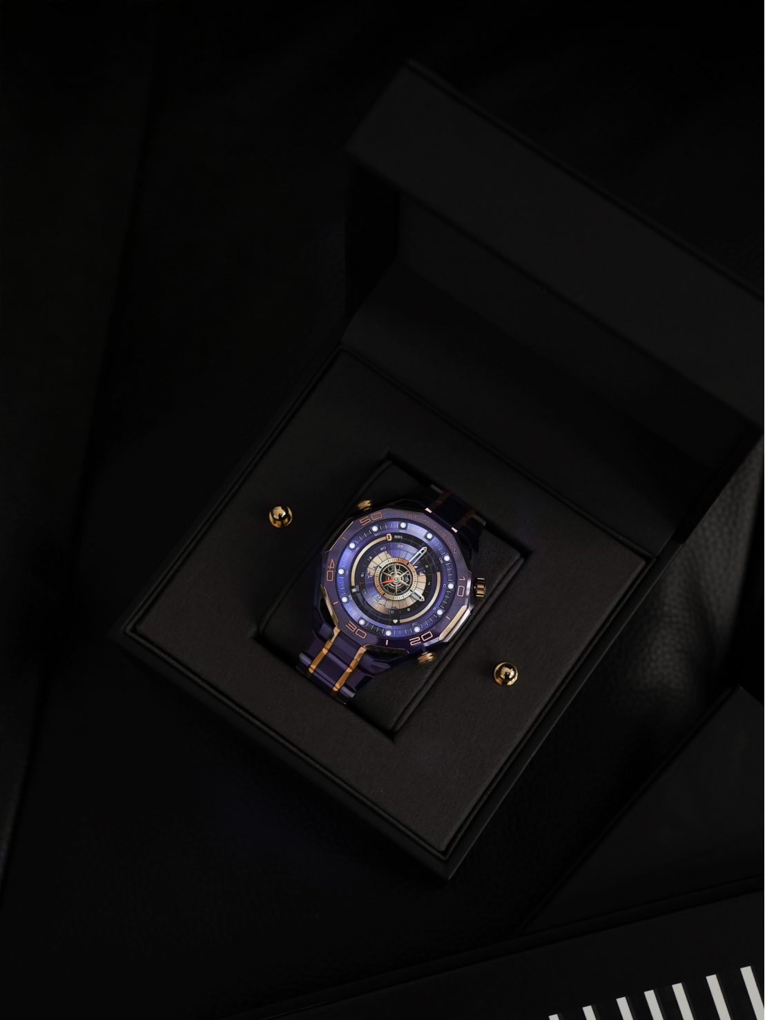 就像产品命名所描述的那样,华为WATCH ULTIMATE DESIGN 非凡大师紫金款采用中国传统文化中象征吉祥富贵的紫金配色,同时通过独特的选材用料及工艺处理,让尊贵奢华在这款手表上看得见、更摸得着。