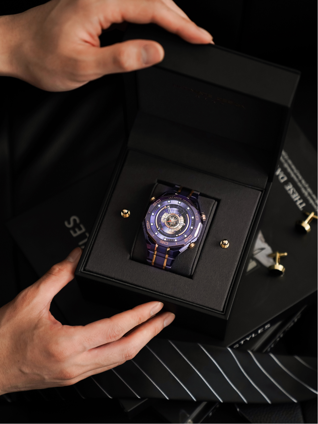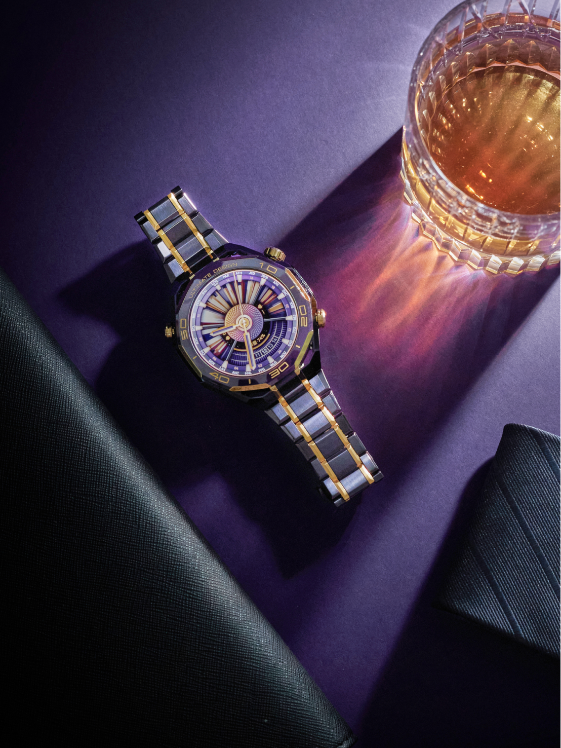 它的表体采用特别的八边镂空设计,大幅减重的同时佩戴起来也更加牢固。表带部分更为讲究,主体选用钛合金材质,以航空级紫色离子镀膜工艺进行着色,辅以 24K 镀金加以装饰,不仅精致感拉满,更拥有极强的坚固耐用性。