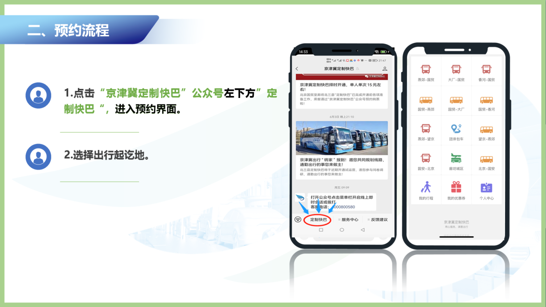 为了满足市民出行需求,定制快巴从涿州多个大型社区出发,在早高峰5:50至6:50之间每20分钟一个班次,沿途经过香邑溪谷、理想城、翡翠城等地,乘客可使用“京津冀定制快巴”微信公众号购票,就近灵活预约乘车。上高速后直达北京六里桥东地铁口。北京地区则由六里桥客运站始发,中途设置了六里桥地铁站(F口),发车时间为18:00、18:15、18:30、18:45共计4班,行程时间约为70分钟。