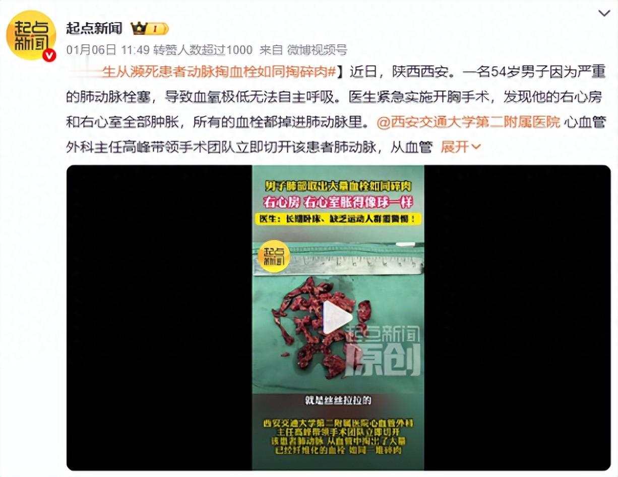 医护人员紧急为他开通了绿色通道手术,术中发现肺动脉被血栓完全堵死了,切开血管后发现血栓完全纤维化,如同烂肉一般。