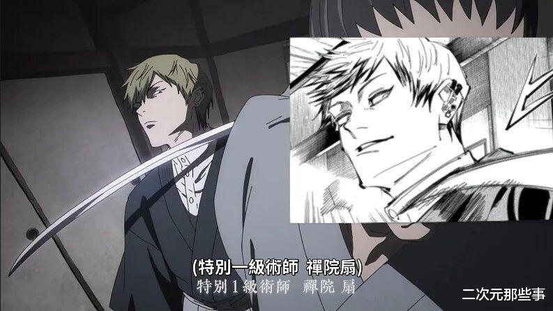 然而到了动画,禅院直哉登场后一直绷着一张脸,神情凝重得仿佛在为父亲担忧,即便听到父亲的死讯,神色也没有太大的变化,完全没有了漫画中那标志性的得意笑容。明眼人都能看出,动画组的初衷是想弱化角色的负面特质,避免其过于招恨,或许还希望通过这种调整让角色更易被大众接受。