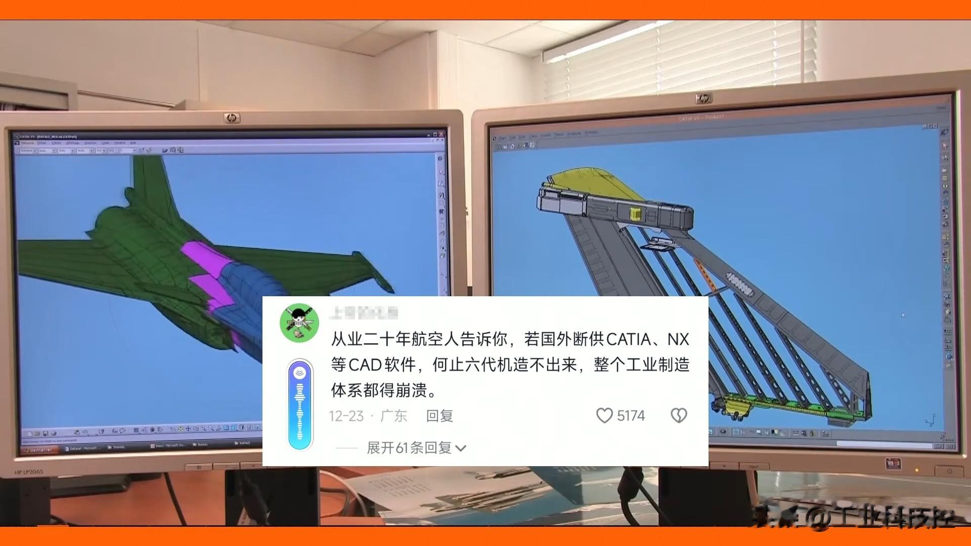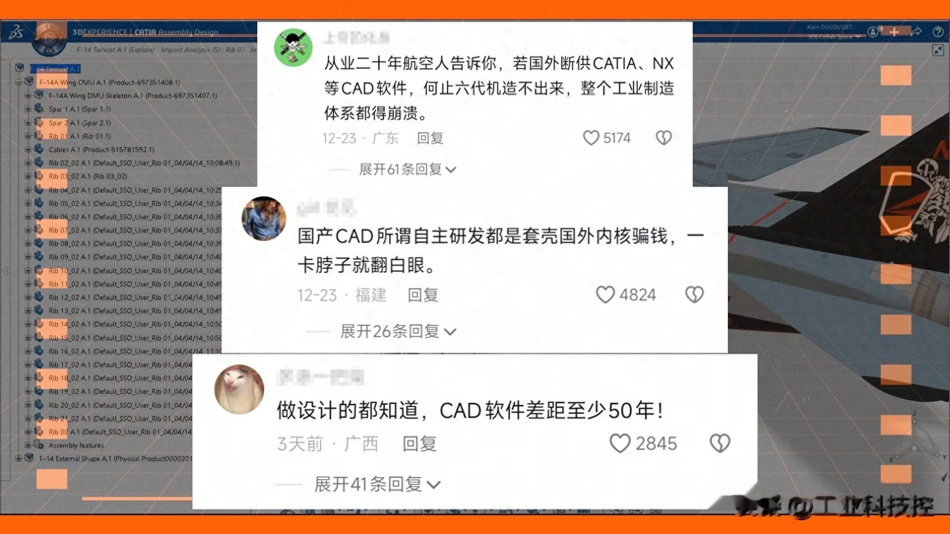 我们先来鉴定第一个评论:“从业二十年航空人告诉你,博主说的是真的,若国外断供CATIA、NX等CAD软件,何止六代机造不出来,整个工业制造体系都得崩溃。”