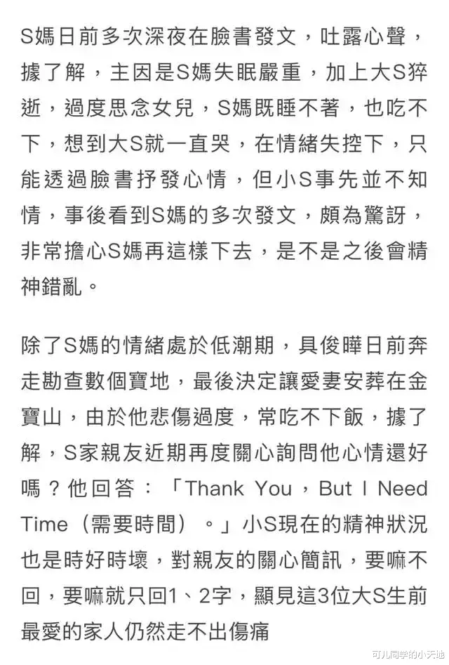 人死不能复生,最痛苦的还是家人。S妈更是多次在深夜发文,说自己好像有点撑不下去。小S看到妈妈的状态之后,更是十分担心。
