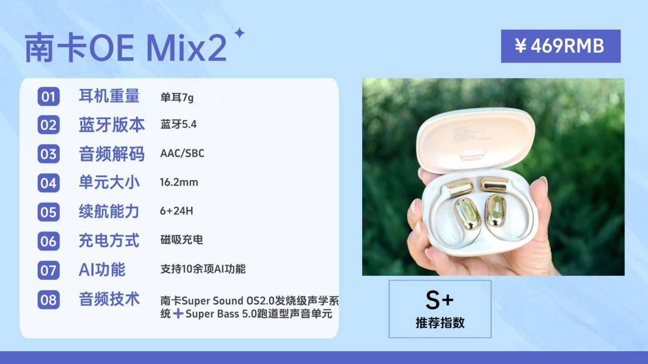 作为开放式声学技术的先驱品牌,南卡对声音的要求极为严格。OE Mix2采用自研Super Bass5.0跑道型高性能单元、OS2.0发烧级声学系统,加上6+3维传感空间音频技术,使声音解析力与保真度可达99.9%。无论是低频下潜还是细节表现,在同档价位几乎没有对手,多位数码评测人都将其称作“千元级的音质天花板”。