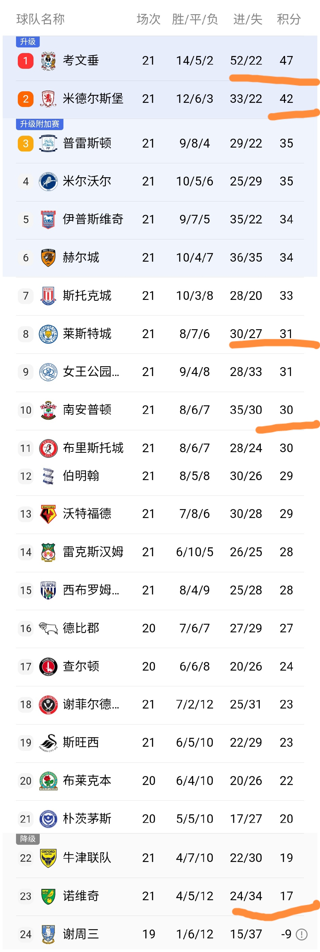 而英超前冠军莱斯特城队排在了升级附加赛区之外,莱斯特城队本赛季已经输了6场比赛,表现不尽如人意,莱斯特城如果按目前的状态,或许这个赛季回不到英超了,所以莱斯特城队要加油啊。