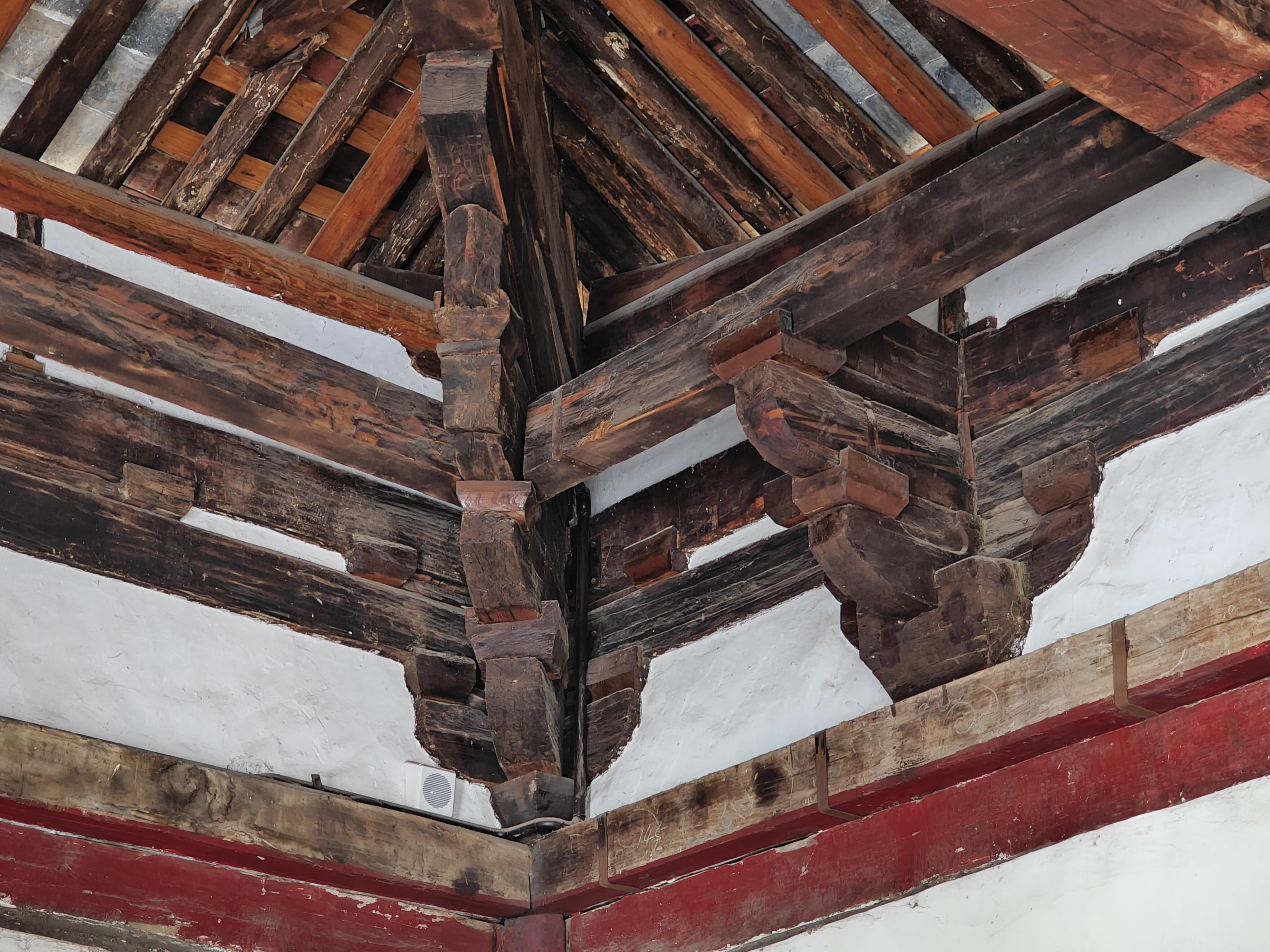 绕到殿后,能看到后檐的柱础埋在土里半截,上面的刻纹被雨水泡得发胀,却依然能看出是莲花的形状。有根柱子的底部微微开裂,工匠用铁箍紧紧勒着,铁箍上的锈迹和木头的暗红色混在一起,像是给老伙计系了条腰带。这种带着伤痕的坚持,比任何完整的新建筑都更有力量。