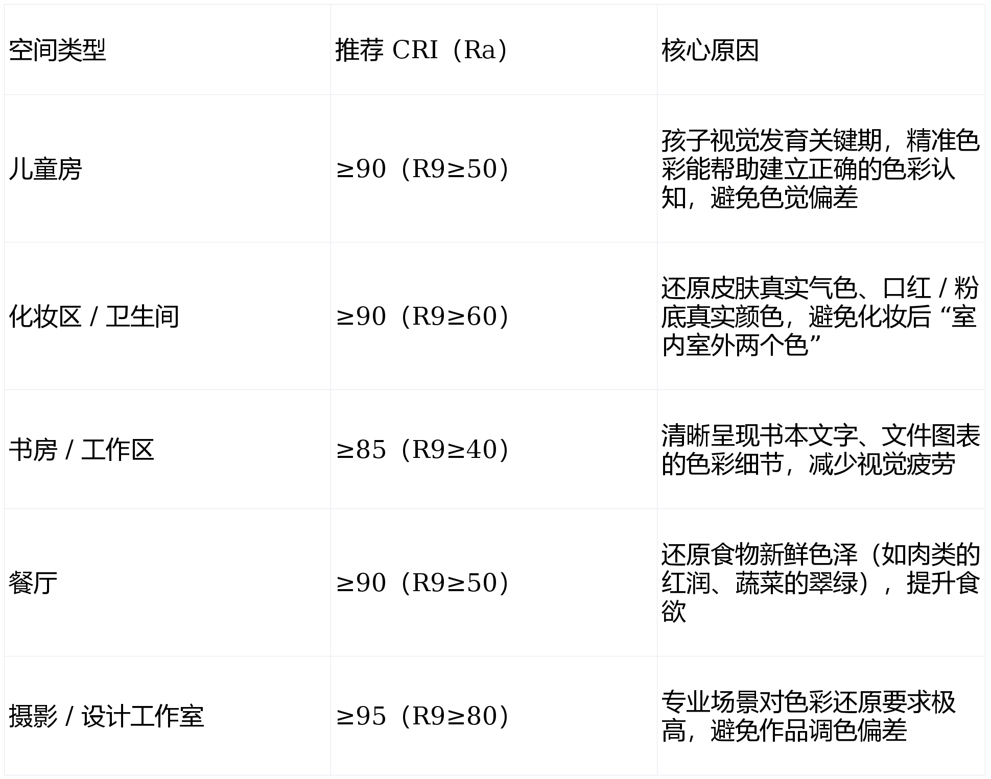 适用场景:化妆区、餐厅、儿童房等对色彩还原要求高的空间,需同时关注 Ra 和 R9。