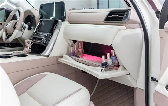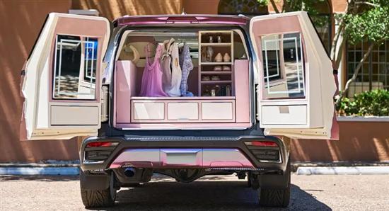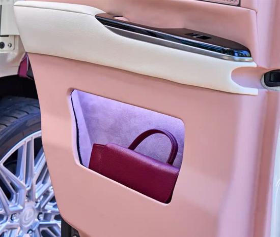 内饰采用白色与粉色相搭配,与车身外观相呼应。此外,中央扶手区域设置成各种美妆物品的收纳区,车门下方的储物槽则专为女性放包设计。值得一提的是,后备厢重新设计,成为全新的衣帽间,会有抽屉、鞋柜以及衣架等等。