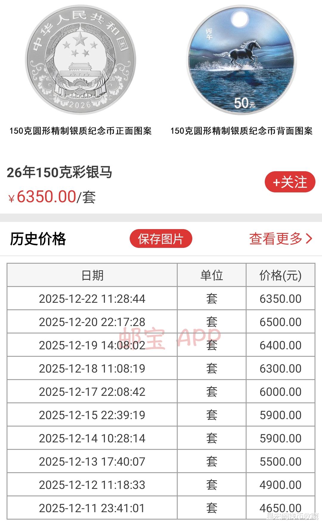 2026年马年金银纪念币发行也有一段时间,目前整个市场行情也发生了比较大的变化,特别是150克圆形彩色银币月下奔马。从最低的时候市场行情一度下跌到4400~4500元左右,之后又开启了上涨,原盒版市场行情最高的时候也超过6500元以上,封装版更是超过7000元以上。
