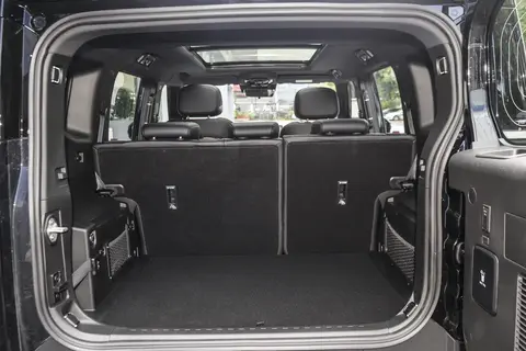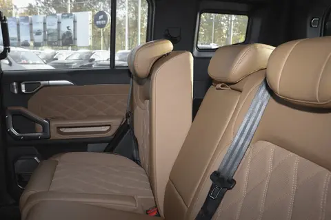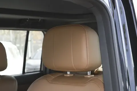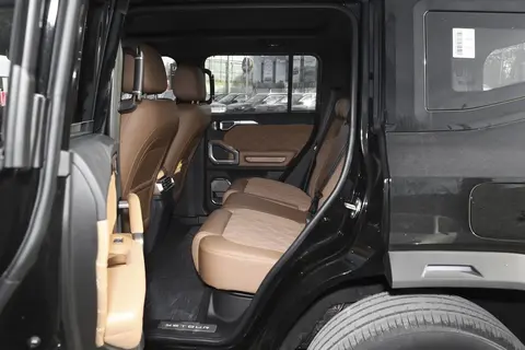 一靠近实车,硬派方盒子造型的气场更直观,多边形格栅嵌着字母标,矩阵式LED大灯点亮后边缘线条很清晰,不像有些车型灯光发散,背负式备胎用的是全尺寸,还带了防刮材质,户外跑的时候不用太担心磕碰。车身颜色我重点看了深海蓝和哑光公路灰,深海蓝在阳光下能看出细微的金属颗粒,质感很足,哑光公路灰摸起来是磨砂手感,耐脏性看着更好(这是品牌推出的特色配色,目前有品牌专属优惠,具体政策可咨询门店)。伸手摸了摸车身接缝处,缝隙很均匀,没有高低不平的情况,打开车门时“嘭”的一声闷响很扎实,销售说车身用了大量高强度钢,光关门的手感,就让人对家用安全性多了份底气。