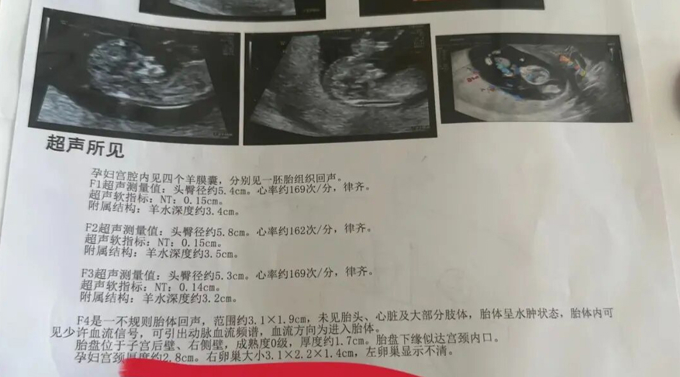 据王女士讲述,她去年9月自然受孕,11月首次产检显示为单胎,后续两次检查陆续增至双胎、三胎。为弄清情况,12月她前往沈阳某医院复检,结果竟查出四胎。