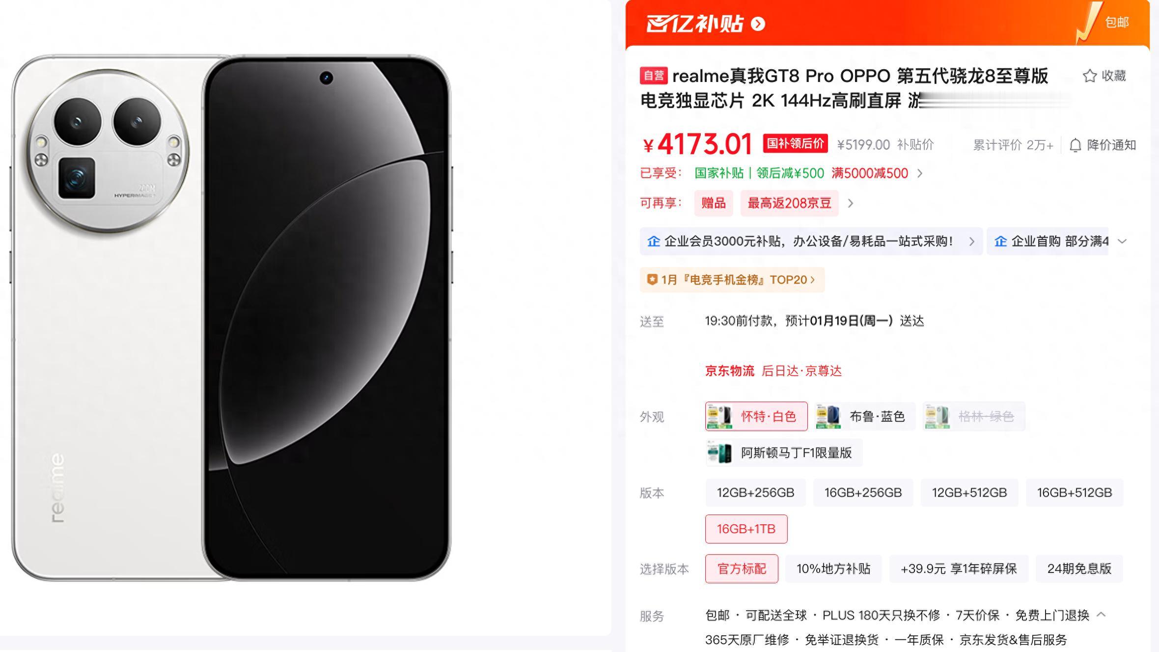 今天推荐的机型是真我GT8 Pro,16GB+1TB国补优惠价仅为4173元,该机的发布于2025年10月21日,16GB+1TB版售价为5199元。因为真我回归OPPO,所以目前该机的商品名已经添加了“OPPO”关键词,所以后续的售后服务由OPPO负责基本上实锤了。在硬件配置上,该机兼顾电竞体验和旗舰影像,应该是目前性价比最高的国产旗舰,有需求的小伙伴可以关注一下。
