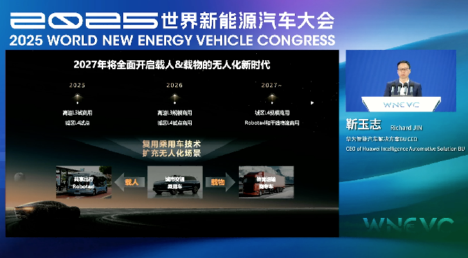 在技术发展路径上,靳玉志介绍了华为乾崑的阶段性规划。2025年,ADS 4系统首发面向L3技术架构的高速商用解决方案,具备高速L3试点商用能力及城区L4测试能力;2026年,在法规允许前提下,力争实现高速L3规模商用及城区L4商用试点;2027年,随着高速与城区NCA功能普及,L3将实现规模放量,城区L4进入商用阶段,Robotaxi与干线物流逐步落地,全面开启载人&载物的无人化新时代。