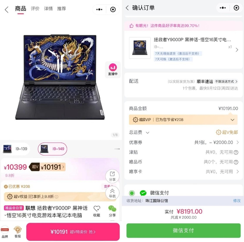 比如说唯品会,这次平台上面联想拯救者笔记本电脑,原来折扣后售价10399元,再加上唯品会SVIP用户的9.8折优惠,最后叠加政府补贴20%,8191元就能到手。