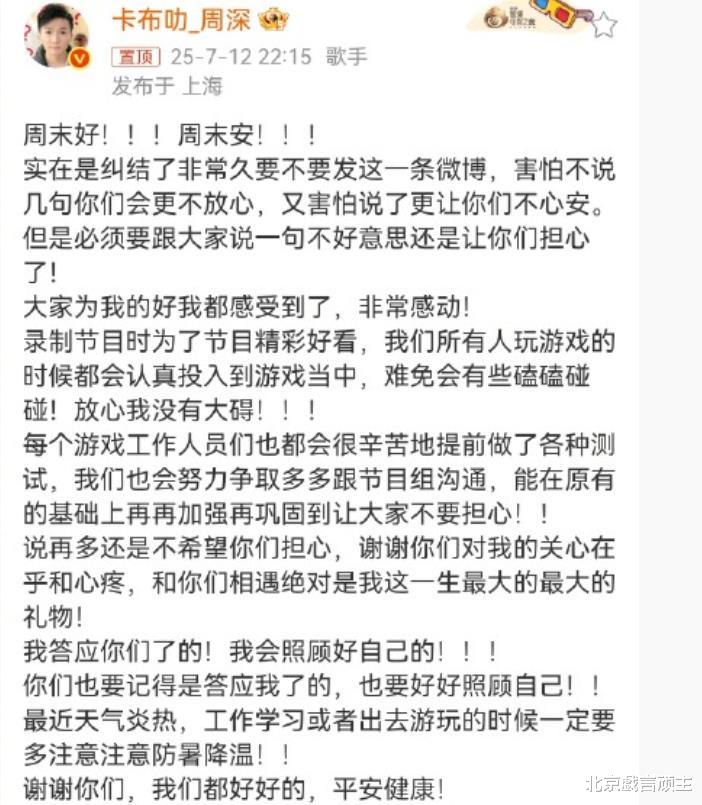 随后表示,录制节目时,为了节目好看,所有人玩游戏时都很认真地投入,过程当中,难免会有些磕磕碰碰,放心,我没有大碍,每个游戏,工作人员都会提前进行测试,我们也会努力多多跟节目组沟通,能在原有的基础上,再加强巩固到让大家不要担心!