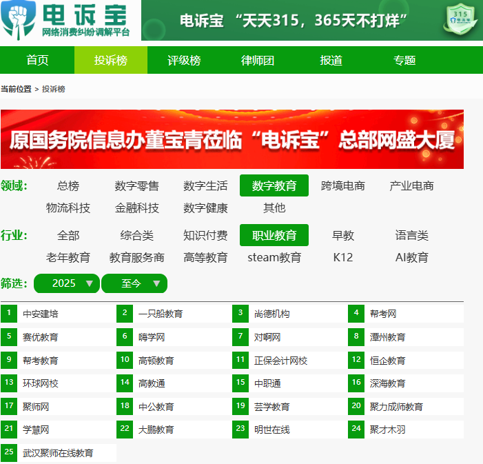 根据“电诉宝”2025年至今受理的职业教育领域用户有效投诉显示(依据投诉量排行),正保会计网校排名第11位,最新评级为“建议下单”。其他被投诉的类似平台依次为:中安建培、一只船教育、尚德机构、帮考网、赛优教育、嗨学网、对啊网、潭州教育、帮考教育、高顿教育、恒企教育、环球网校、高教通、中职通、深海教育、聚师网、中公教育、芸学教育、聚力成师教育、学慧网、大鹏教育、明世在线、聚才木羽、武汉聚师在线教育等。