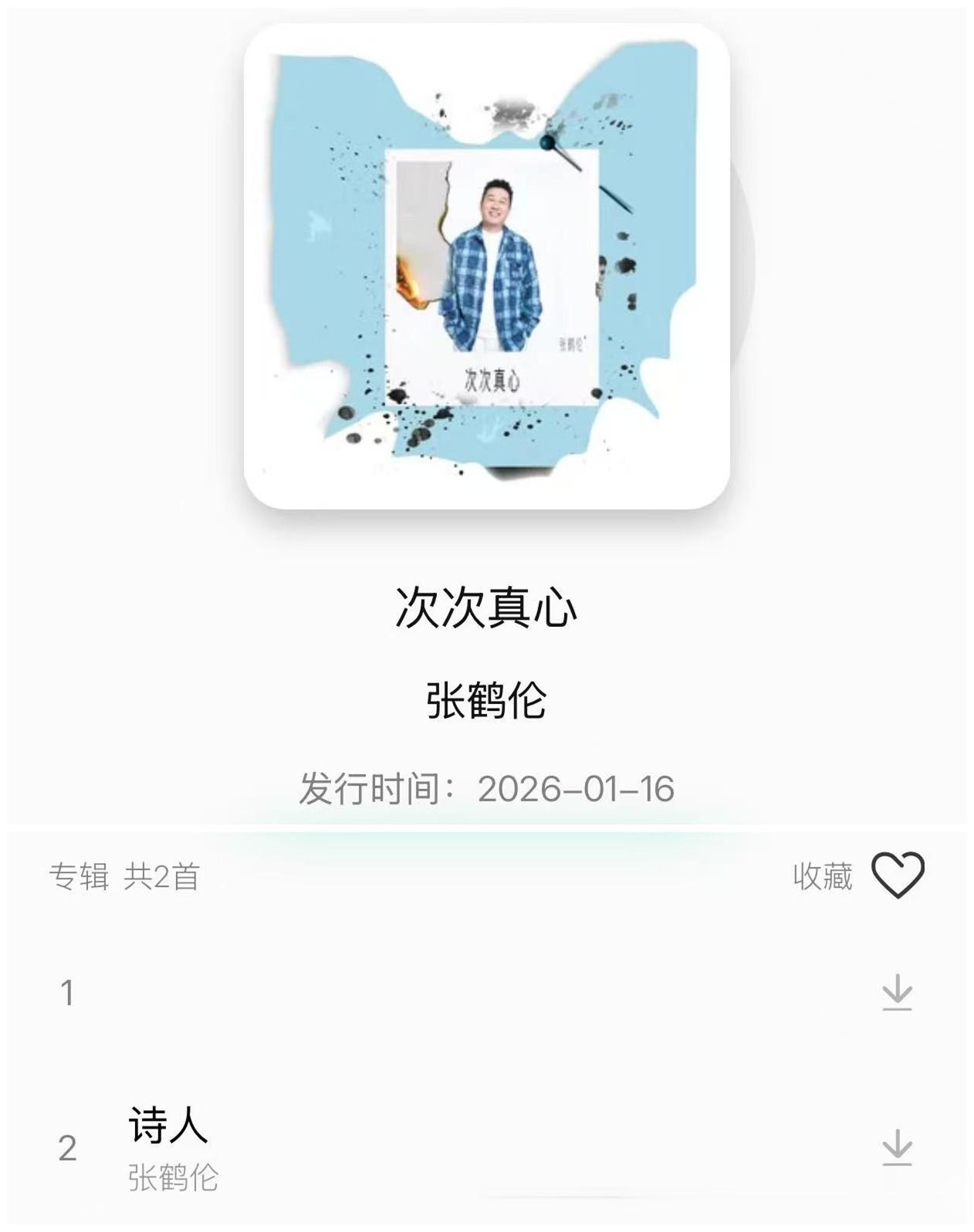 2026年1月,张鹤伦发布的新专辑包含《次次真心》、《诗人》这两首歌。