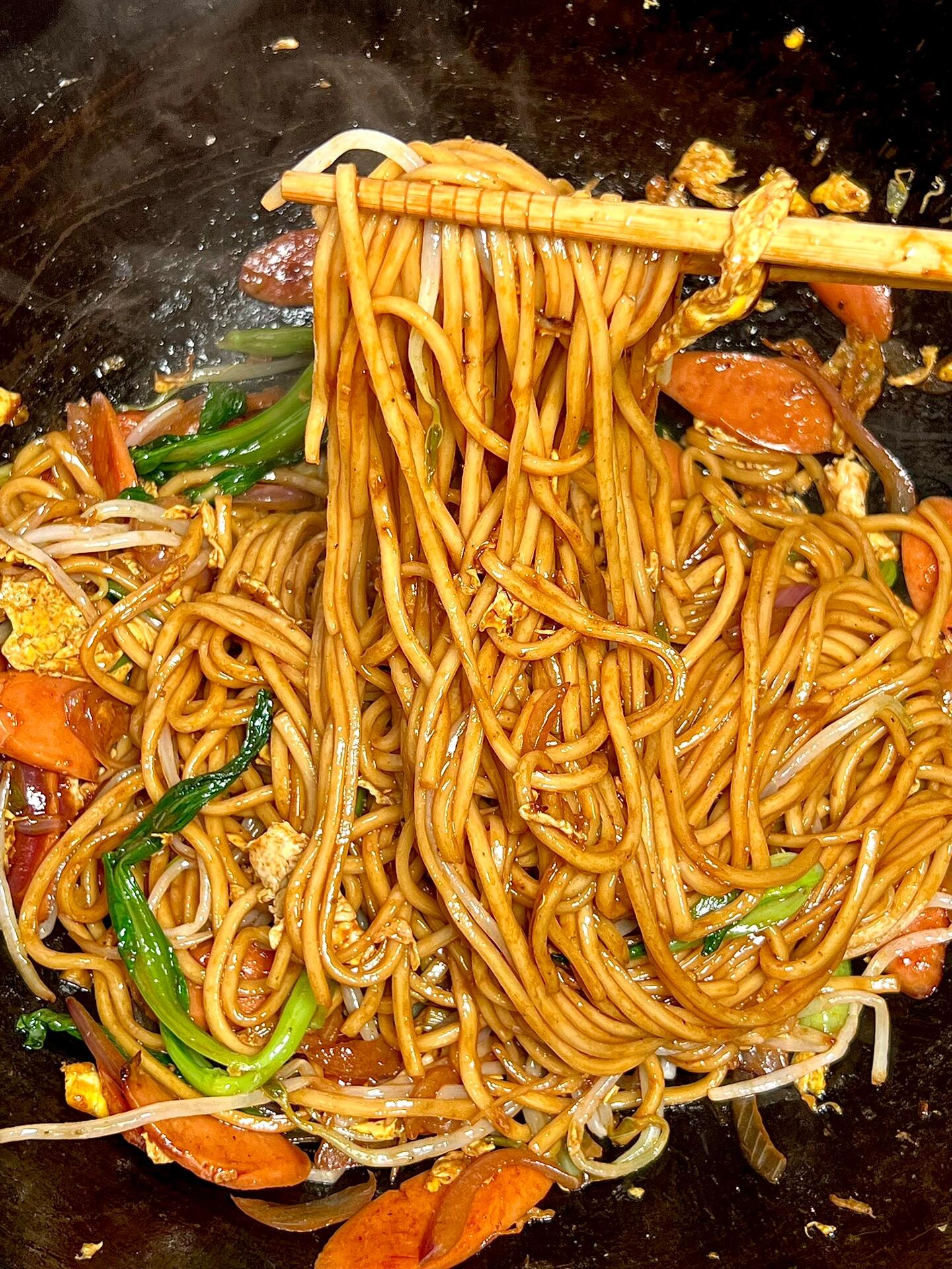 💡技巧:左手拿锅铲,右手用筷子,像洗衣服一样上下翻动,让每根面条都裹满酱汁!