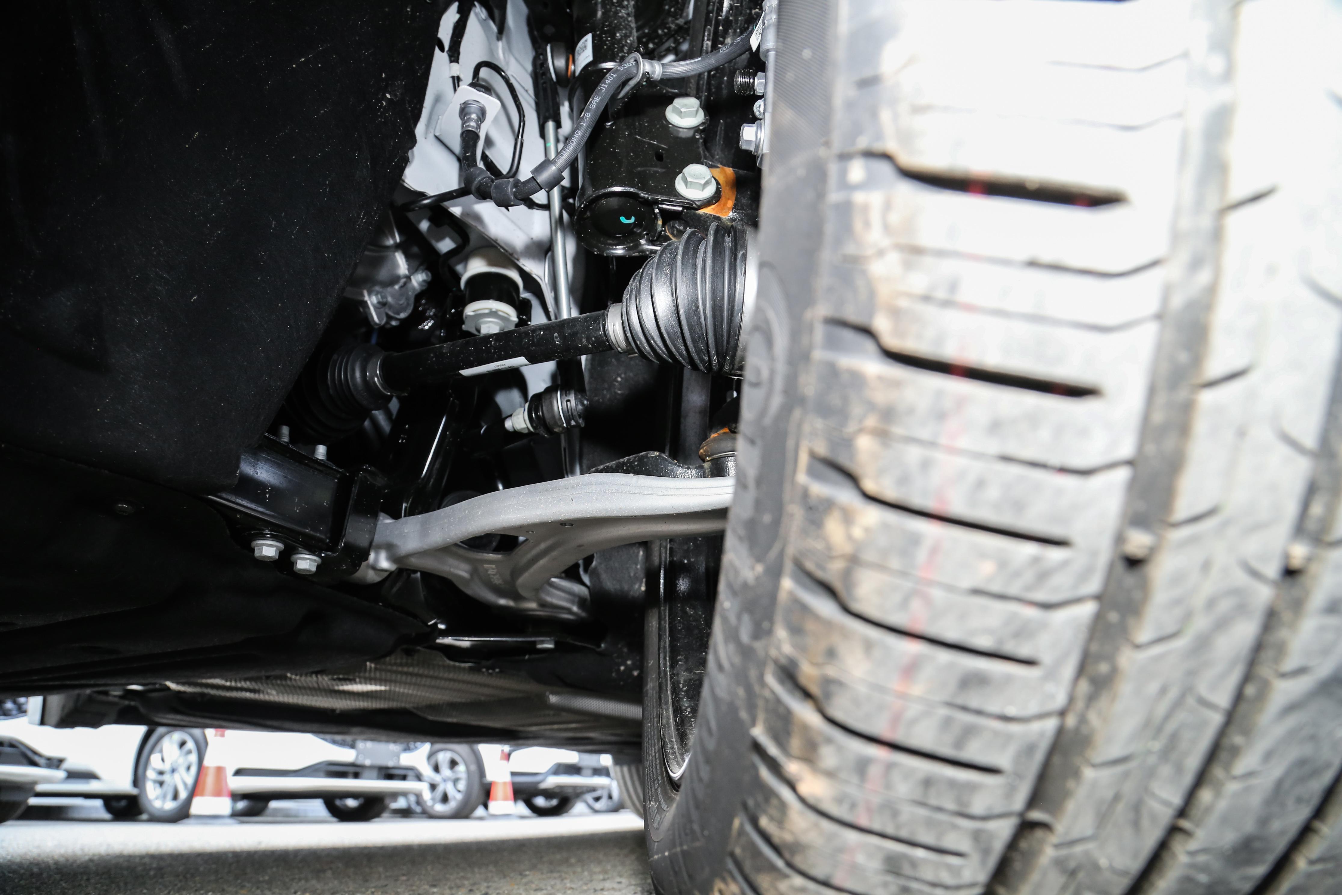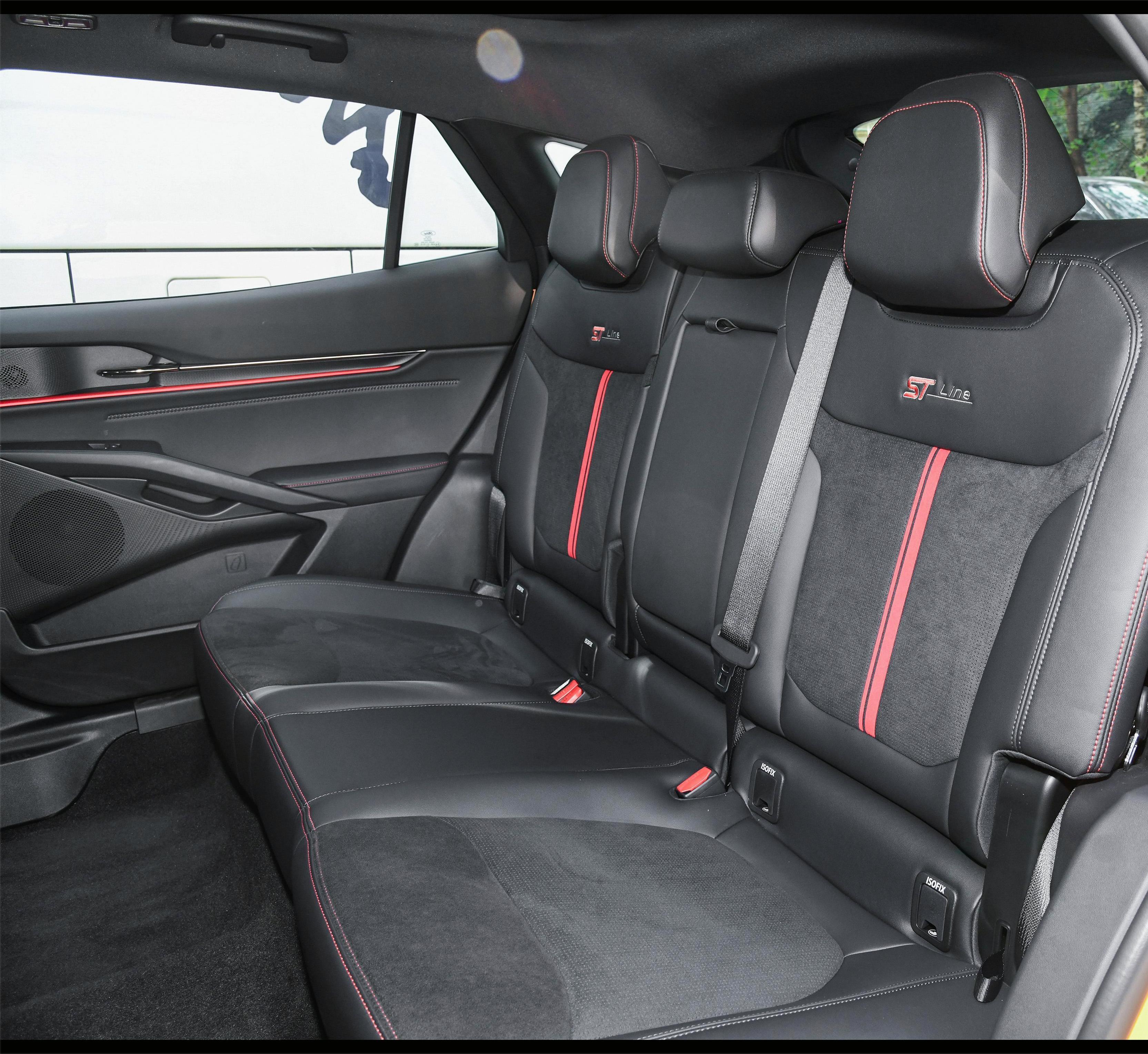 为了能够更为直观的展现该车的空间,为此我们还专门进行了乘坐体验。像我的身高为180公分,体型要偏胖一些,但是坐进车内后排,整个腿部有着接近两拳的空间表现,甚至可以轻松翘起二郎腿。同时前排座椅给到了电动调节、加热以及通风功能,很好的提升乘坐舒适性,并且在此功能基础上,该车的座椅采用了皮/翻毛皮材质,也能够很好的固定身体,还提供了不错的承托性和包裹性,值得一提的是车内座椅还采用了红色的缝线设计,这一细节也很直观的提升车内的运动氛围。